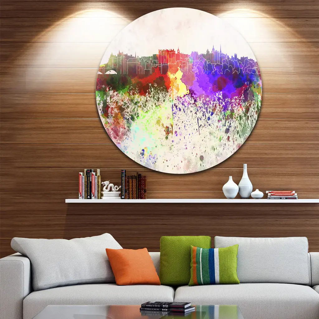 Bring Contemporary Abstraction to your home with this large Circle Metal wall art. This Edinburgh Skyline Metal Artwork makes it the focal point of any room or office. - White Gloss Coating ensures colors are extra vibrant with light reflection.- Aluminum grade Sheet Metal with 1 inch mounting frame on the back giving the illusion that the artwork is floating on the wall..- Mounting Brackets are included along with instructions.- High Quality Digital images are created directly into a glossy aluminum panel producing a stunning and captivating print into the glossy finish of the metal.- Water, Fire and Scratch resistant HD Aluminum panels.- Looks better than any photo paper and guaranteed to last at least 20 years- Easy to clean with a microfiber cloth. Colors are far superior to regular Canvas Art. - Easy to Hang