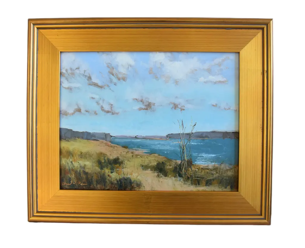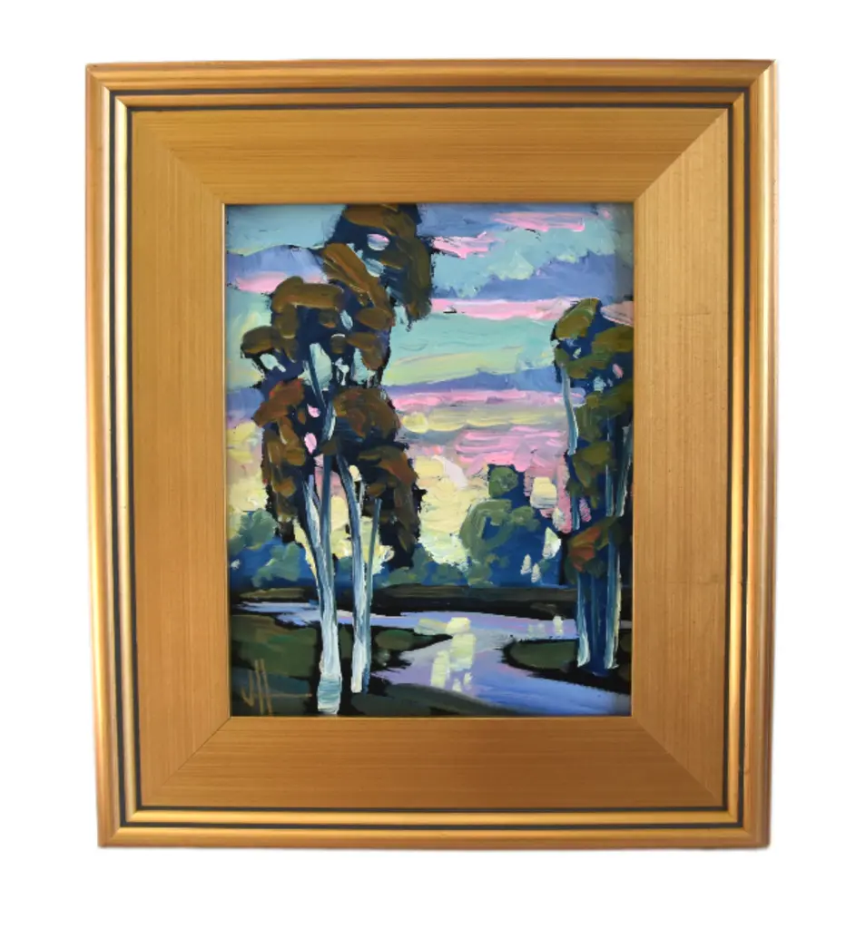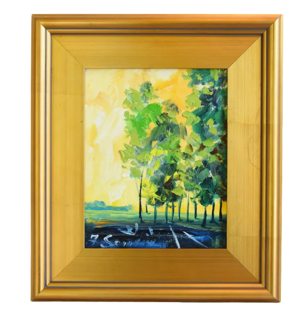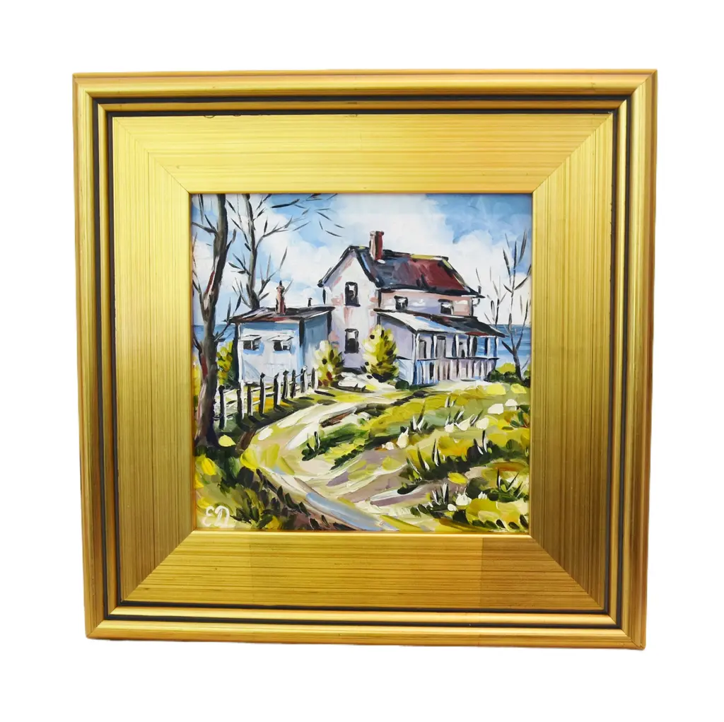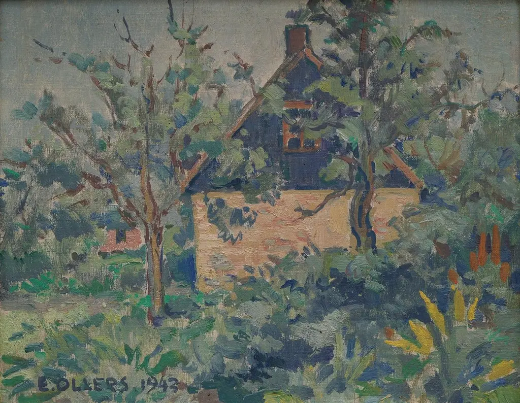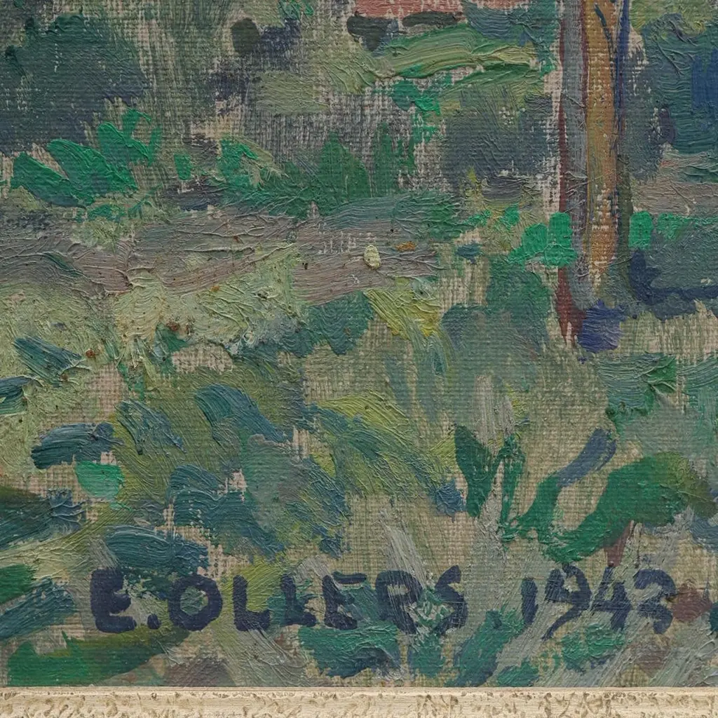 Edvin Ollers – Oil on Panel, “Garden Motif,” Signed and Dated 1943A beautiful and atmospheric oil on panel painting by renowned Swedish artist and designer Edvin Ollers (1888–1959), titled Garden Motif. This work, signed and dated 1943, captures a serene and intimate outdoor scene, rendered in Ollers’ distinctive style that blends naturalistic detail with subtle decorative abstraction.The composition is rich with texture and warm, earthy tones, reflecting the artist’s deep appreciation for Scandinavian landscapes and everyday beauty. The painting measures 27 x 34 cm and is presented in its original frame, which brings the total dimensions to 41 x 48 cm.Framed and in very good vintage condition, this piece is a fine example of mid-20th-century Nordic art and would complement both modern and traditional interiors.