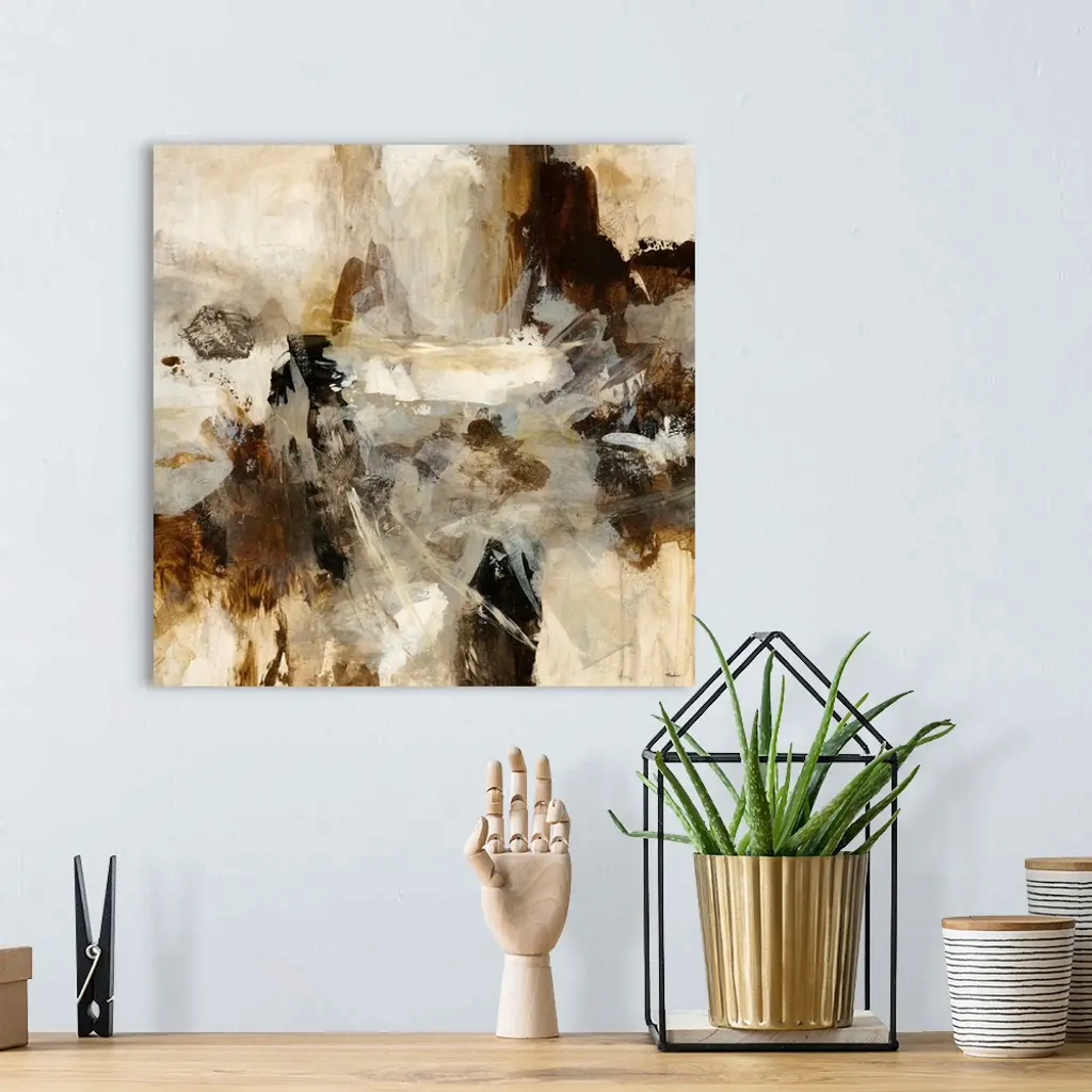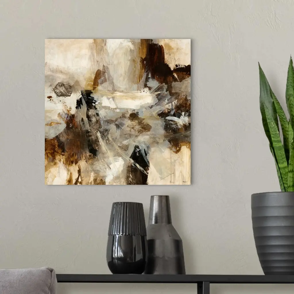 Contemporary tonal abstract painting of overlapping brush strokes varying in length and thickness, oriented in all directions.