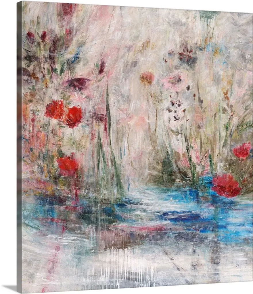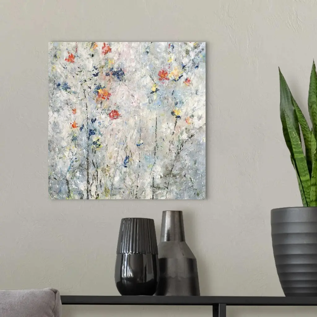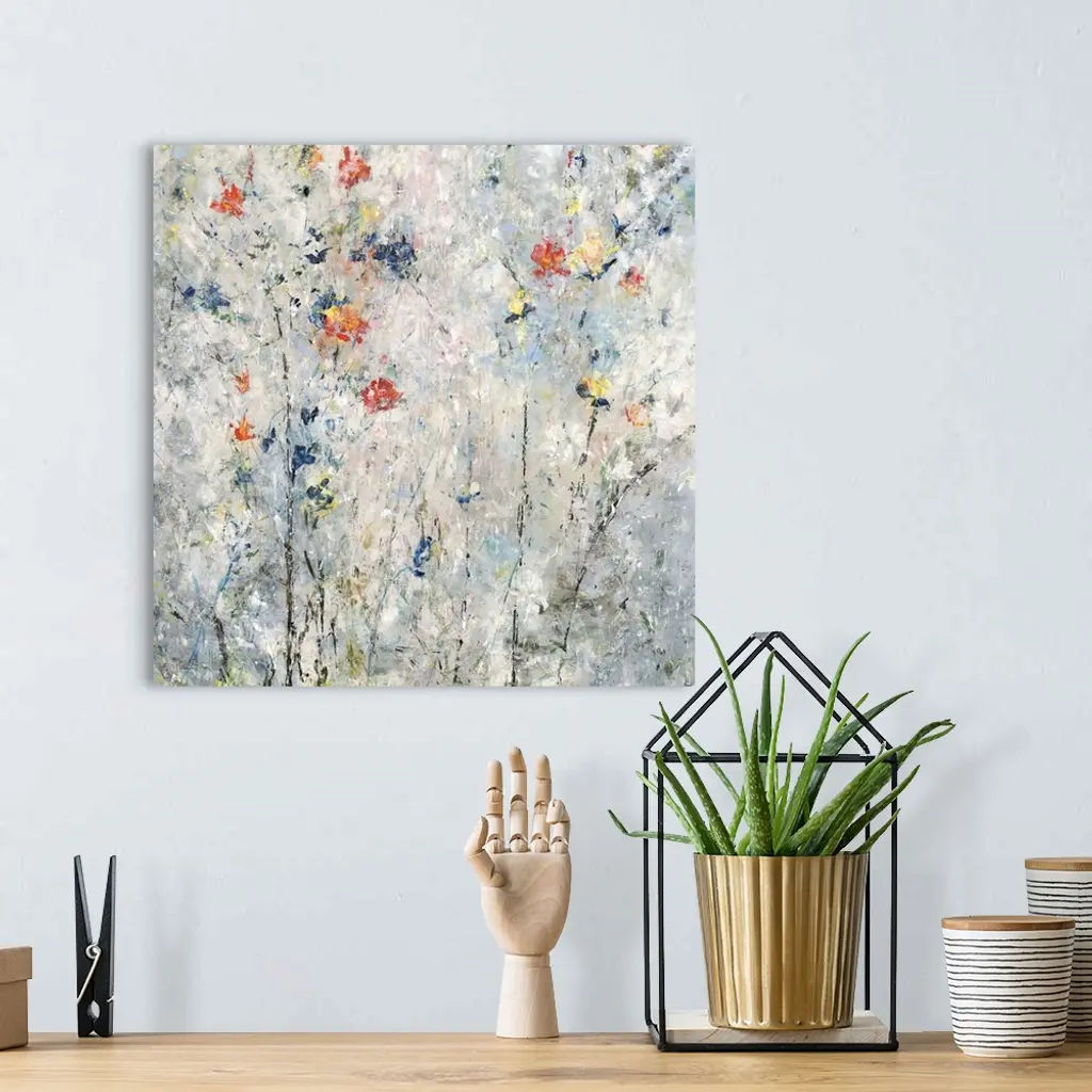Contemporary square painting with abstract flowers in blue, red, orange, and yellow hues on a gray and white background.