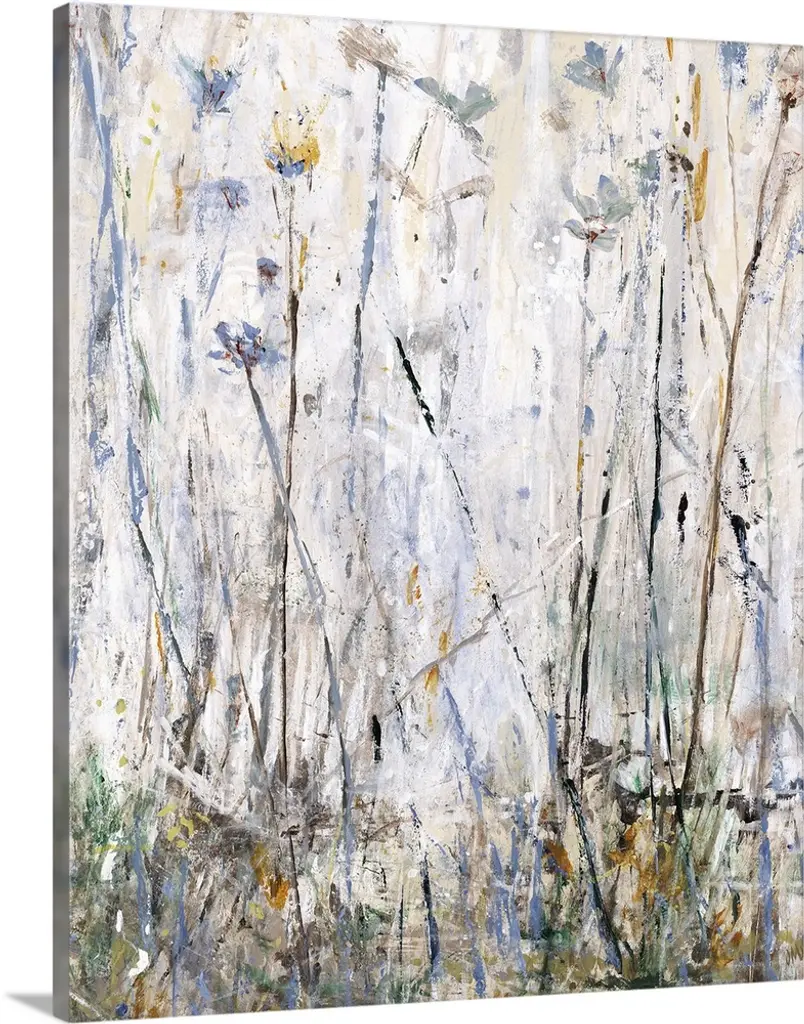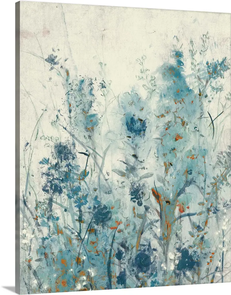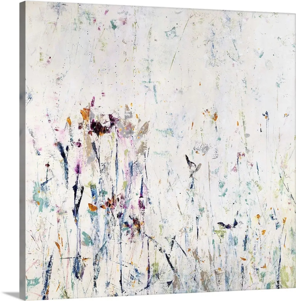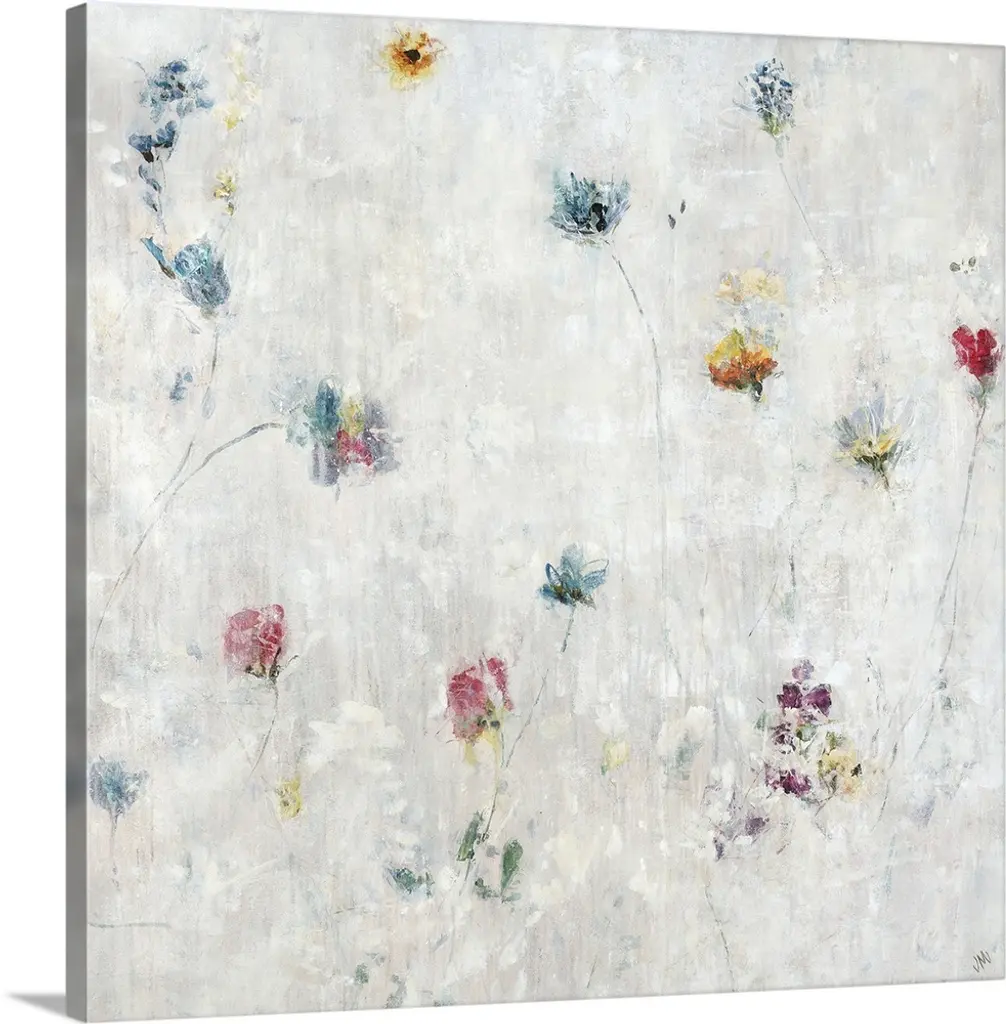 Contemporary square painting with abstract flowers in blue, red, orange, and yellow hues on a gray and white background.