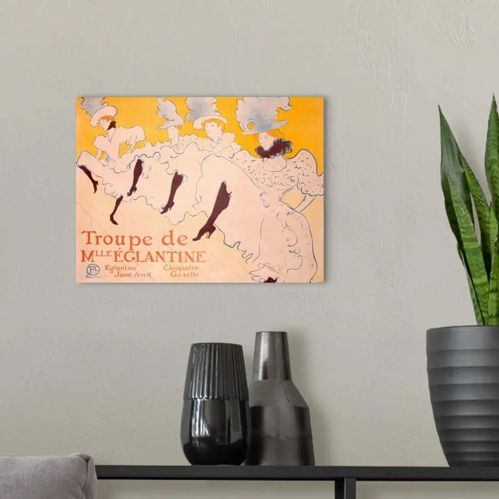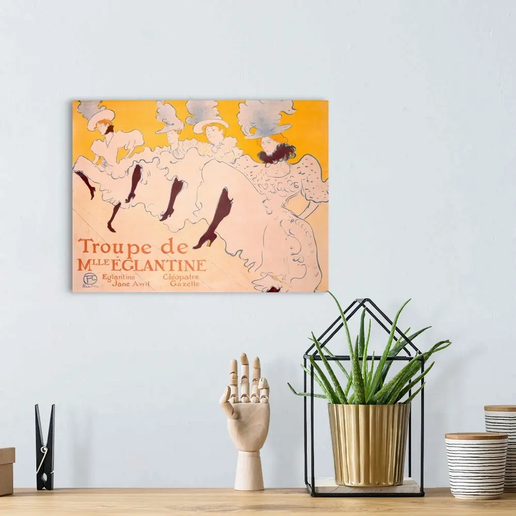 This iconic poster, created by Henri de Toulouse-Lautrec, advertises the Troupe de Mlle Eglantine, a can-can dance group that included famous performers such as Jane Avril, Eglantine, Cleopatre, and Gazelle. Rendered in Lautrec's signature sketchy linework and soft pastel tones, the image captures the synchronized high kicks, frilled costumes, and theatrical flair of Parisian cabaret culture in the late 19th century. The fluid composition, large feathered hats, and vivid energy make this a quintessential piece of Belle Epoque poster art.