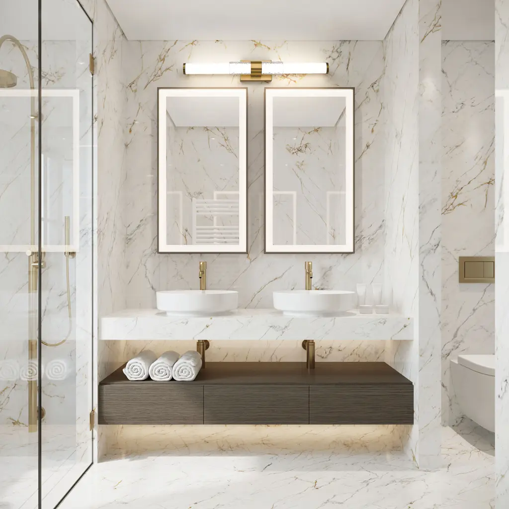 Modern gold adds just the right touch of glam to this wide, softly glowing vanity light. Its fluid glass catches every glimmer, creating a glow that feels both elevated and inviting. Its a showpiece designed to make every reflection feel a little more golden.