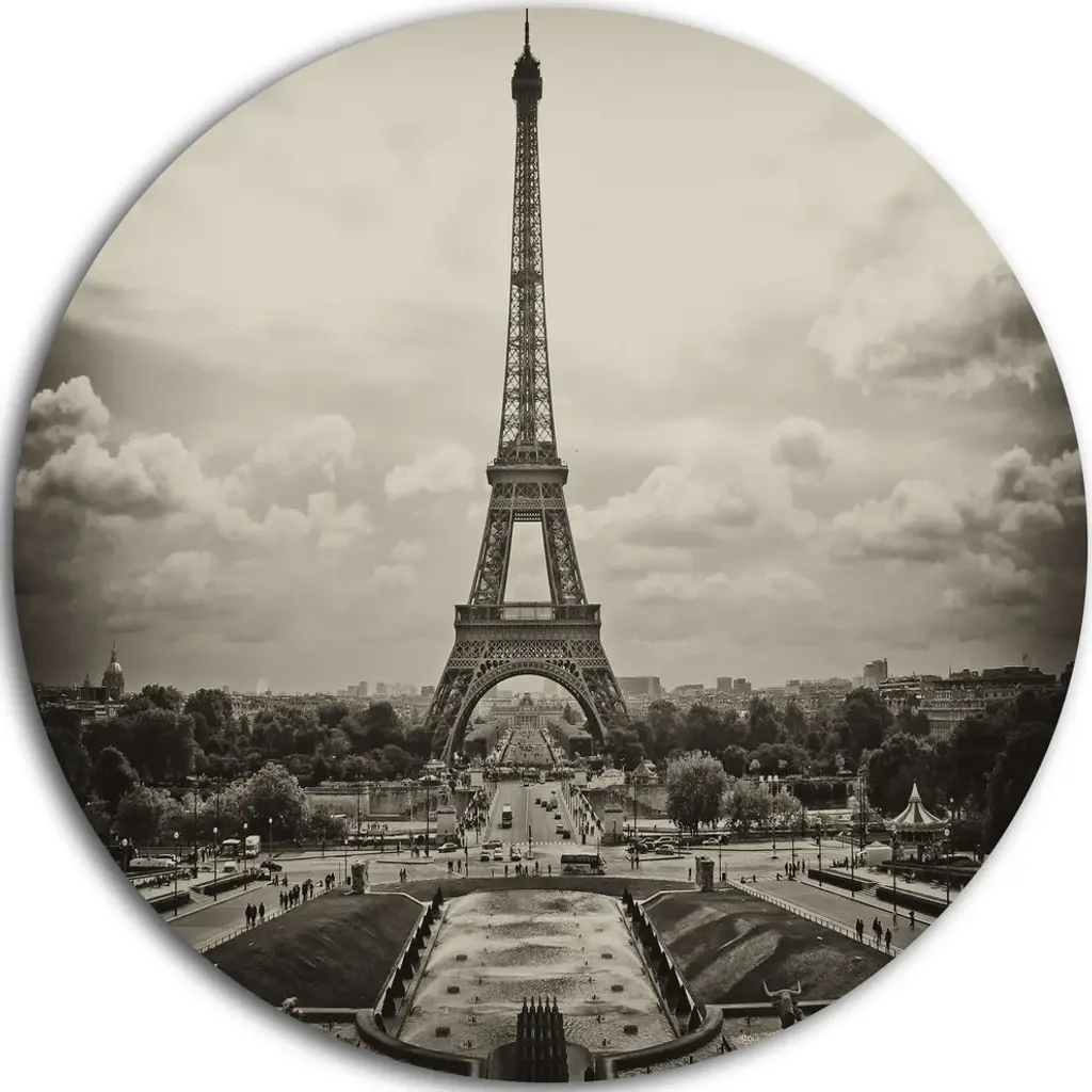 Bring Contemporary Abstraction to your home with this large Circle Metal wall art. This Eiffel and Old Red Car Metal Artwork makes it the focal point of any room or office. - White Gloss Coating ensures colors are extra vibrant with light reflection.- Aluminum grade Sheet Metal with 1 inch mounting frame on the back giving the illusion that the artwork is floating on the wall..- Mounting Brackets are included along with instructions.- High Quality Digital images are created directly into a glossy aluminum panel producing a stunning and captivating print into the glossy finish of the metal.- Water, Fire and Scratch resistant HD Aluminum panels.- Looks better than any photo paper and guaranteed to last at least 20 years- Easy to clean with a microfiber cloth. Colors are far superior to regular Canvas Art. - Easy to Hang