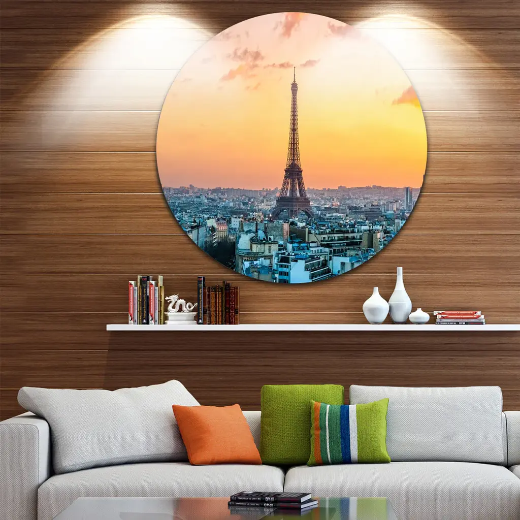 Bring Contemporary Abstraction to your home with this large Circle Metal wall art. This Eiffel at Sunrise in Paris Metal Artwork makes it the focal point of any room or office. - White Gloss Coating ensures colors are extra vibrant with light reflection.- Aluminum grade Sheet Metal with 1 inch mounting frame on the back giving the illusion that the artwork is floating on the wall..- Mounting Brackets are included along with instructions.- High Quality Digital images are created directly into a glossy aluminum panel producing a stunning and captivating print into the glossy finish of the metal.- Water, Fire and Scratch resistant HD Aluminum panels.- Looks better than any photo paper and guaranteed to last at least 20 years- Easy to clean with a microfiber cloth. Colors are far superior to regular Canvas Art. - Easy to Hang