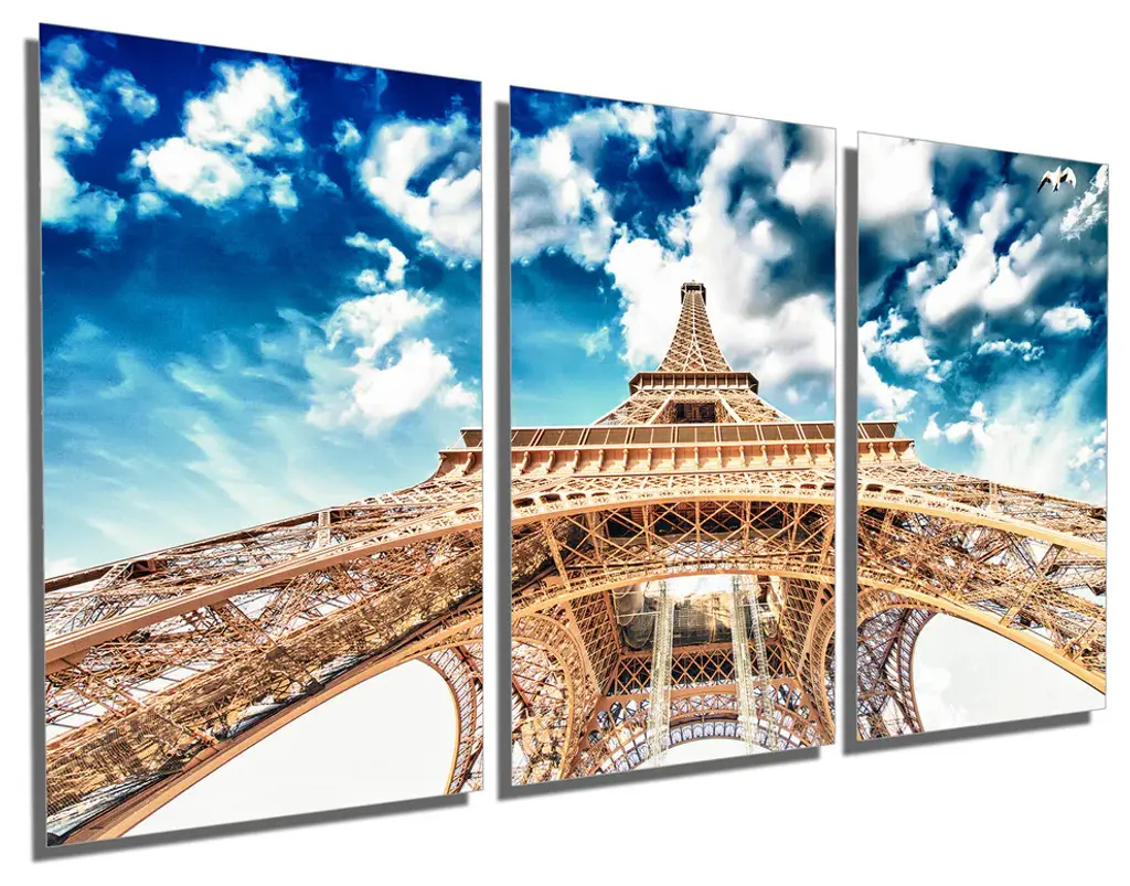 60"œ x 30"œ total size. Ready To Hang! (3 pieces - 20"œ x 30"œ each). 3 Panel Split (Triptych) Metal Print featuring a beautiful shot from under the Eiffel Tower in Paris, France under blue, cloudy skies. Great for interior design and home or office wall decor. Printed on Luxurious, HD aluminum glossy metal panels.. HD aluminum panels. Metal print wall art. Includes Shadow Wall Mount on the back.• Aluminum Metal Wall Art• Made in USA• Ready to hang - No assembly required• Shadow mount hardware on the back• 0.045"œ thick HD Aluminum Panels• Scratch resistant, glossy finish• Superb color clarity, luxurious prints• Epson printing process• For indoor or moisture rich environment use• Easy to clean. Gently wipe with microfiber cloth.