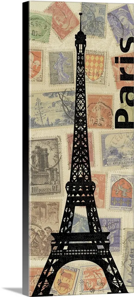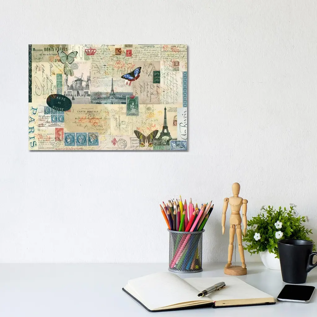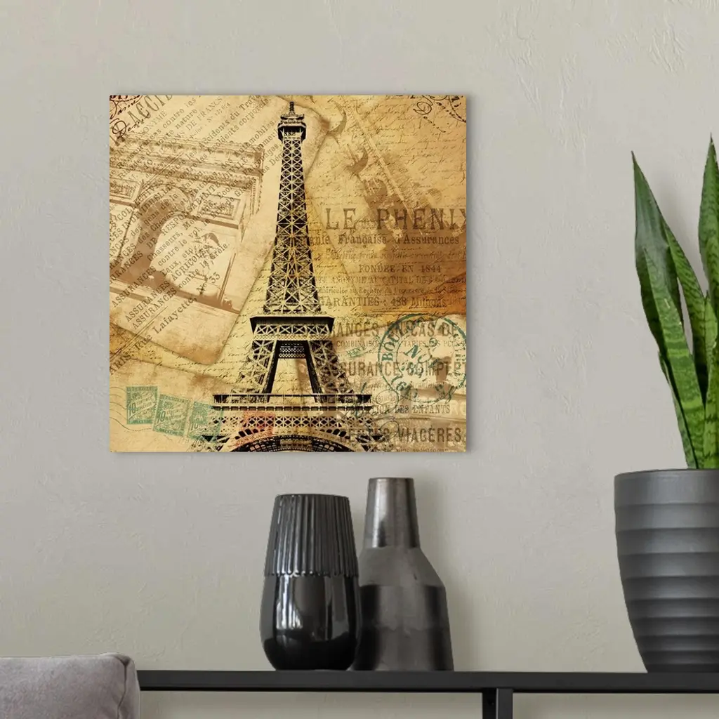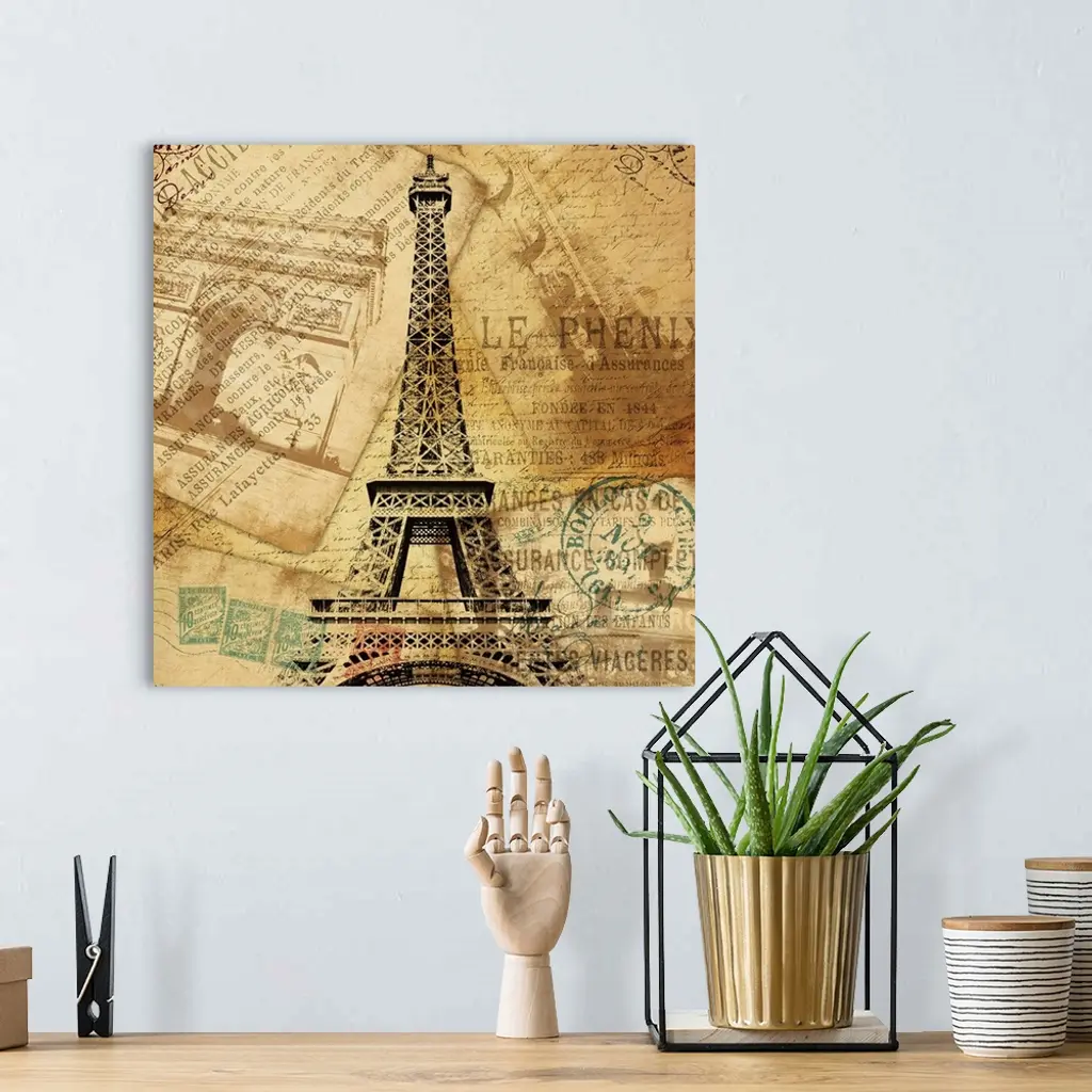 Contemporary artwork of the Eiffel Tower against travel and postage documentation in sepia tone.