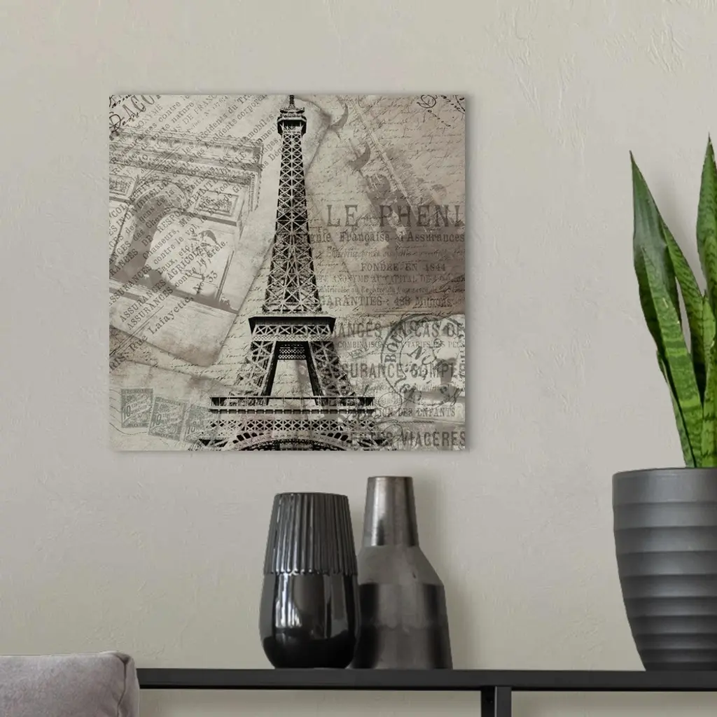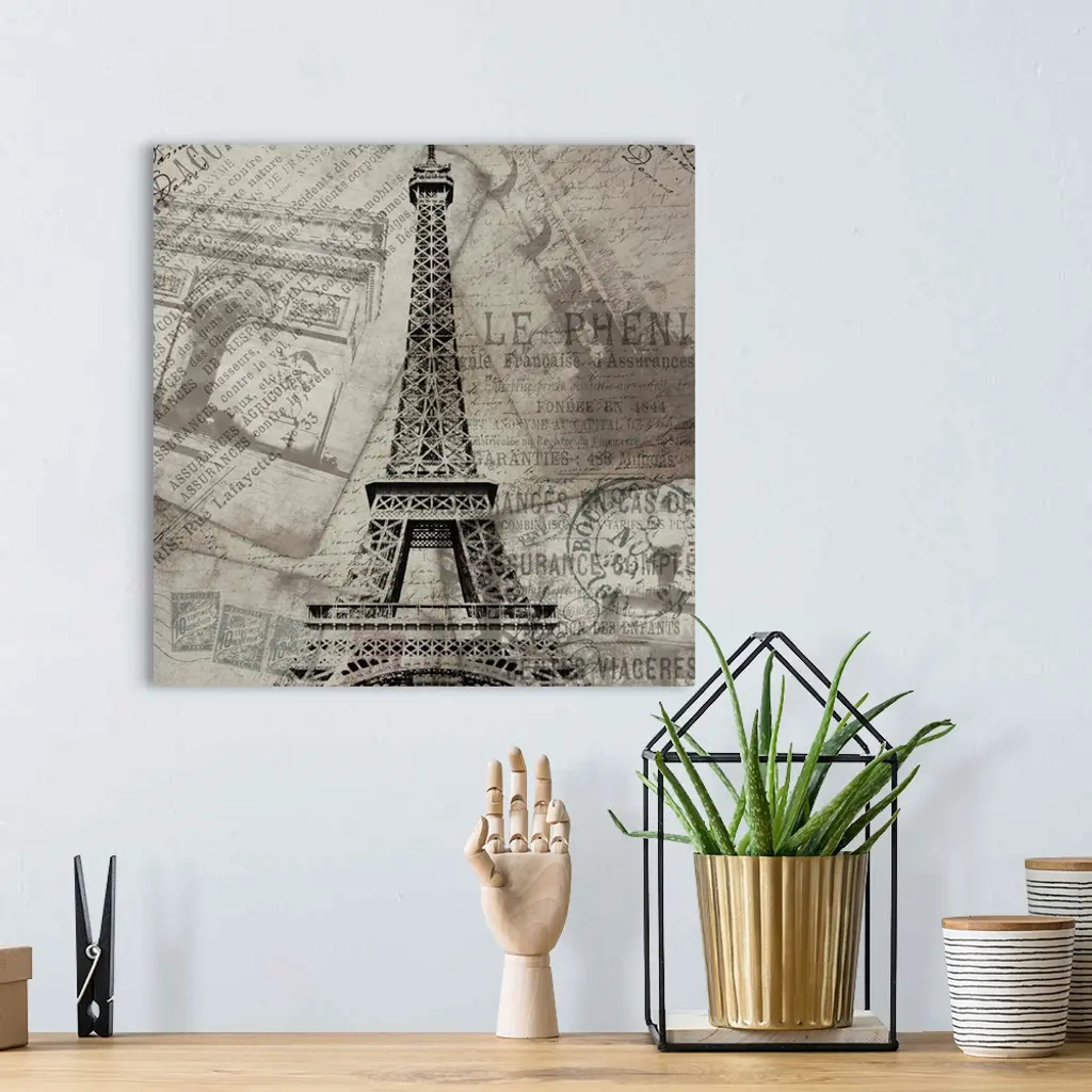 Contemporary artwork of the Eiffel Tower against travel and postage documentation in black and white.