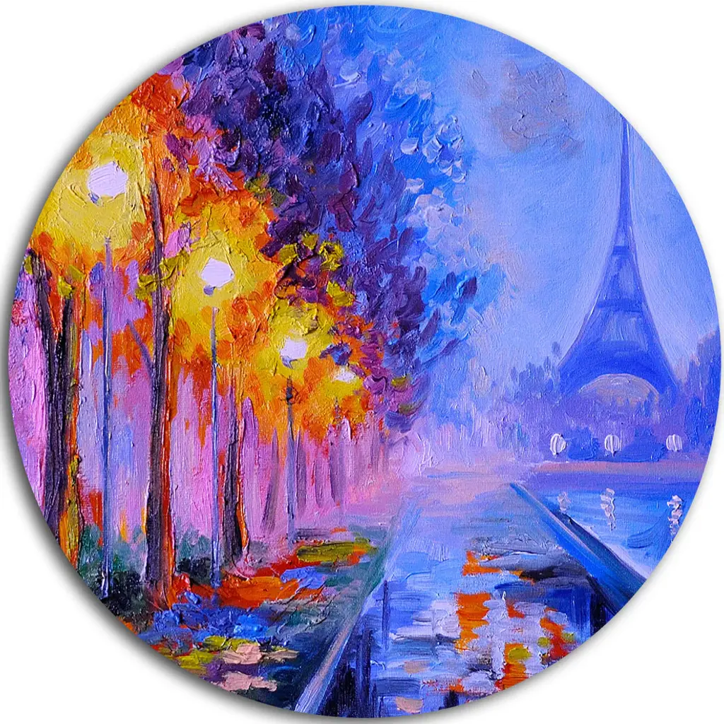 Bring Contemporary Abstraction to your home with this large Circle Metal wall art. This Eiffel Tower View in Fall Metal Artwork makes it the focal point of any room or office. - White Gloss Coating ensures colors are extra vibrant with light reflection.- Aluminum grade Sheet Metal with 1 inch mounting frame on the back giving the illusion that the artwork is floating on the wall..- Mounting Brackets are included along with instructions.- High Quality Digital images are created directly into a glossy aluminum panel producing a stunning and captivating print into the glossy finish of the metal.- Water, Fire and Scratch resistant HD Aluminum panels.- Looks better than any photo paper and guaranteed to last at least 20 years- Easy to clean with a microfiber cloth. Colors are far superior to regular Canvas Art. - Easy to Hang