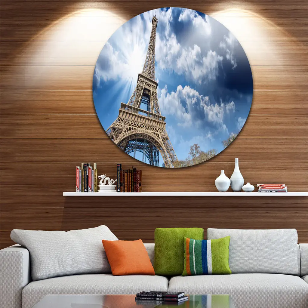 Bring Contemporary Abstraction to your home with this large Circle Metal wall art. This Eiffel Under Blue Sky Metal Artwork makes it the focal point of any room or office. - White Gloss Coating ensures colors are extra vibrant with light reflection.- Aluminum grade Sheet Metal with 1 inch mounting frame on the back giving the illusion that the artwork is floating on the wall..- Mounting Brackets are included along with instructions.- High Quality Digital images are created directly into a glossy aluminum panel producing a stunning and captivating print into the glossy finish of the metal.- Water, Fire and Scratch resistant HD Aluminum panels.- Looks better than any photo paper and guaranteed to last at least 20 years- Easy to clean with a microfiber cloth. Colors are far superior to regular Canvas Art. - Easy to Hang
