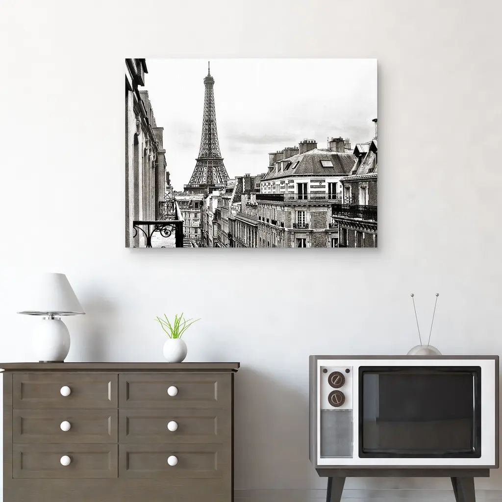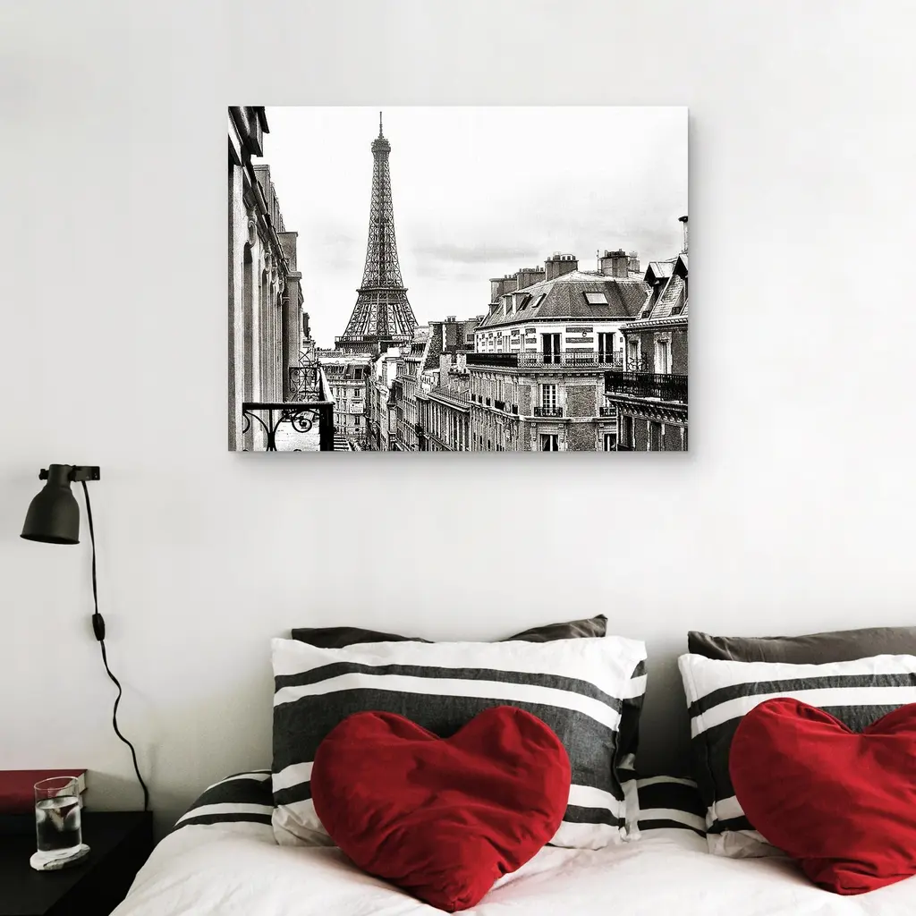 If you're a fan of romance, buttery croissants, decadent cuisine, and fashion, then you'll appreciate this stunning black and white photo print that captures Paris' Eiffel Tower in the background. A stunning photo that offers high contrast yet maintains precise detail, this print is perfect for transporting you back to the City of Love. This giclee print combines extraordinary detail and quality canvas into one affordable package. Offering full-bleed printing, which covers the entirety of the canvas, your new artwork also comes ready to hang; eliminating the need for framing.
