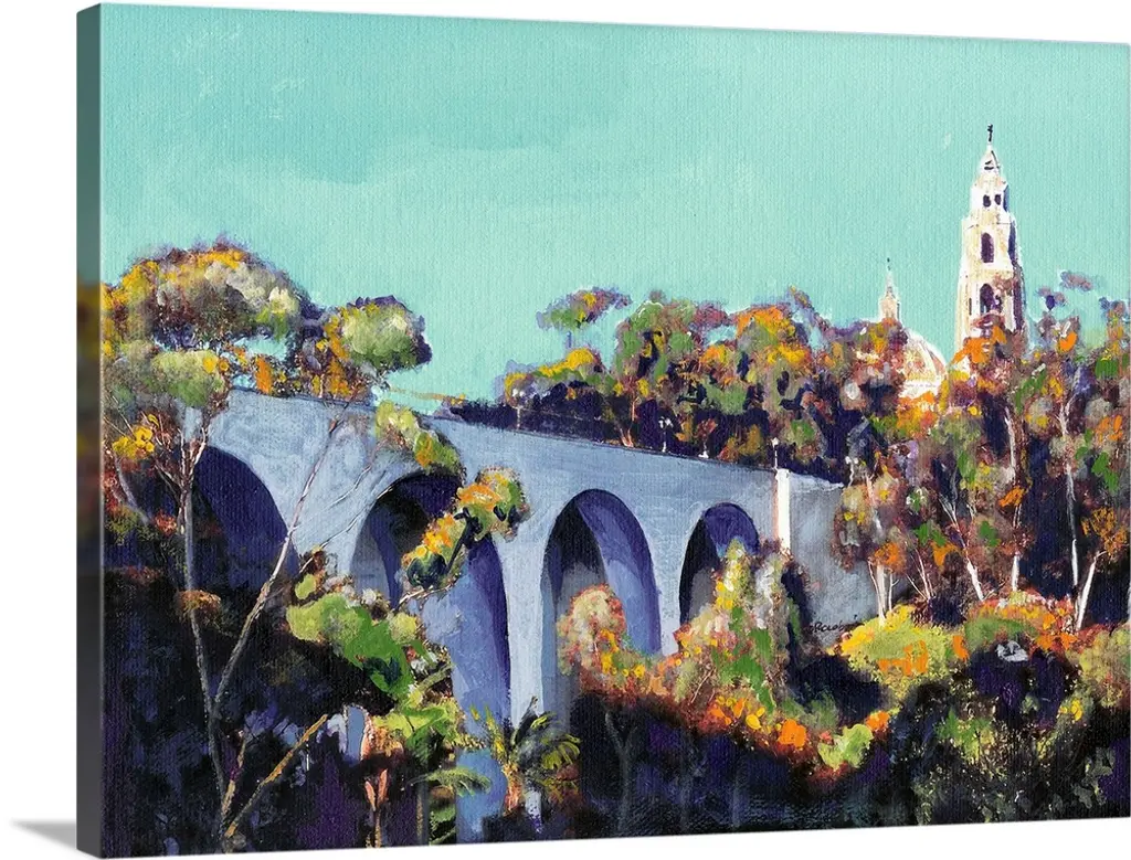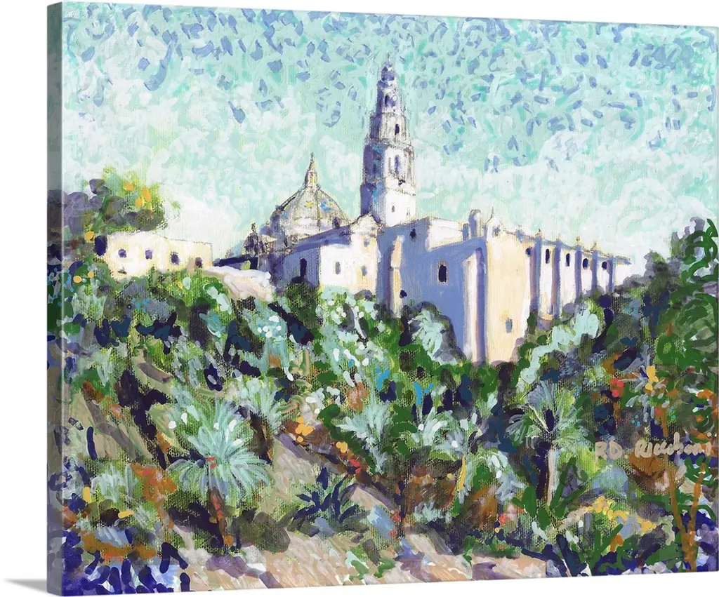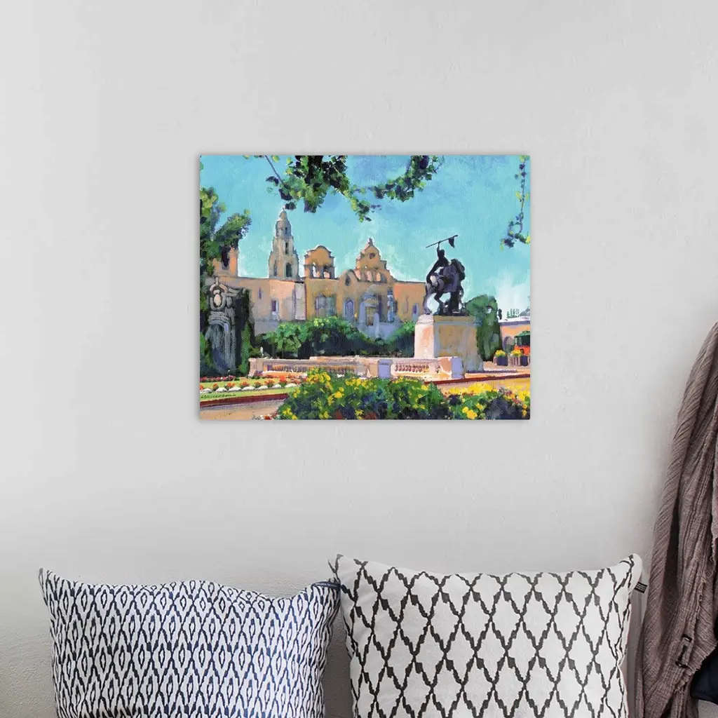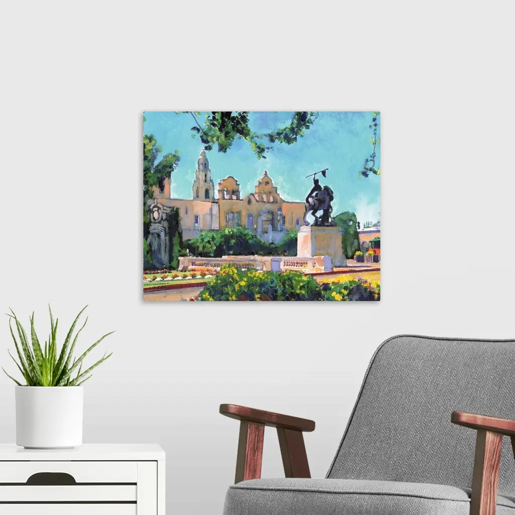 Painting of El Cid Balboa Park in San Diego. Plaza de Panama with statue by Anna Hyatt Huntington. House of Charm building and California Bell Tower are seen to the left.