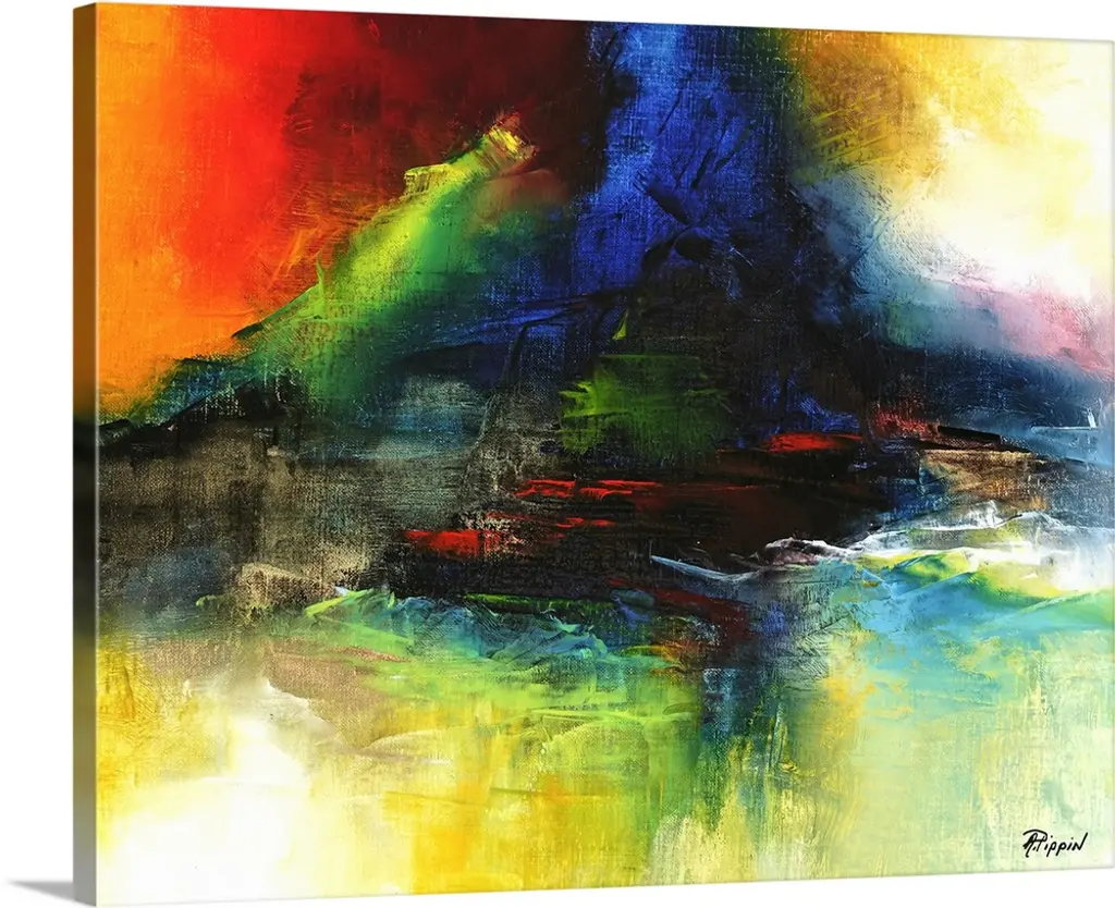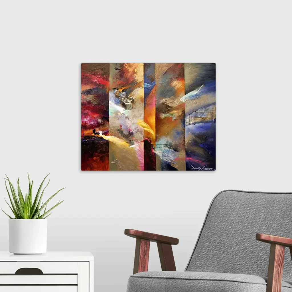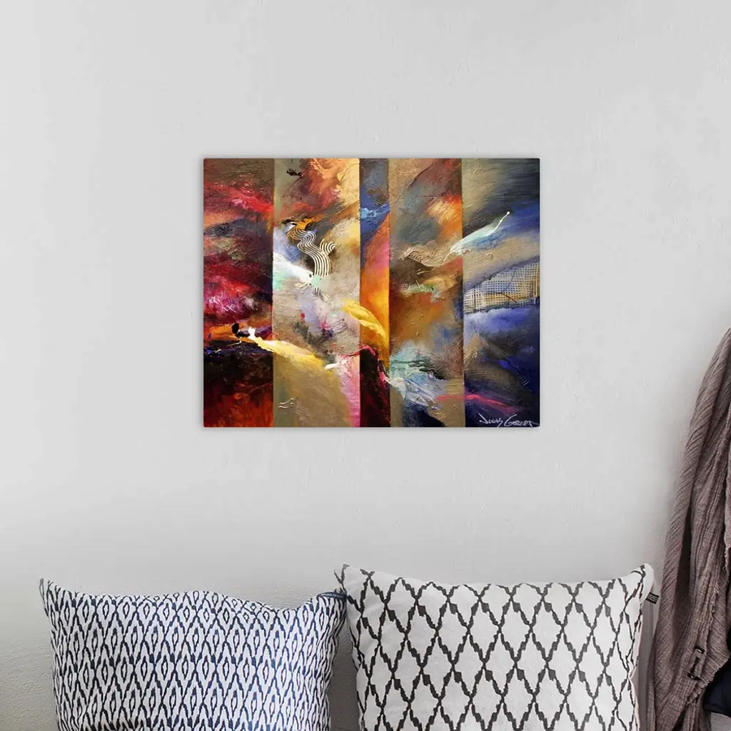 Abstract art piece of several distinct panels with different colors and brushstrokes on them to create whimsical art.