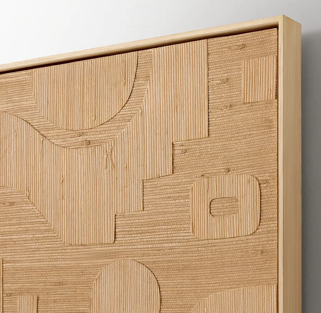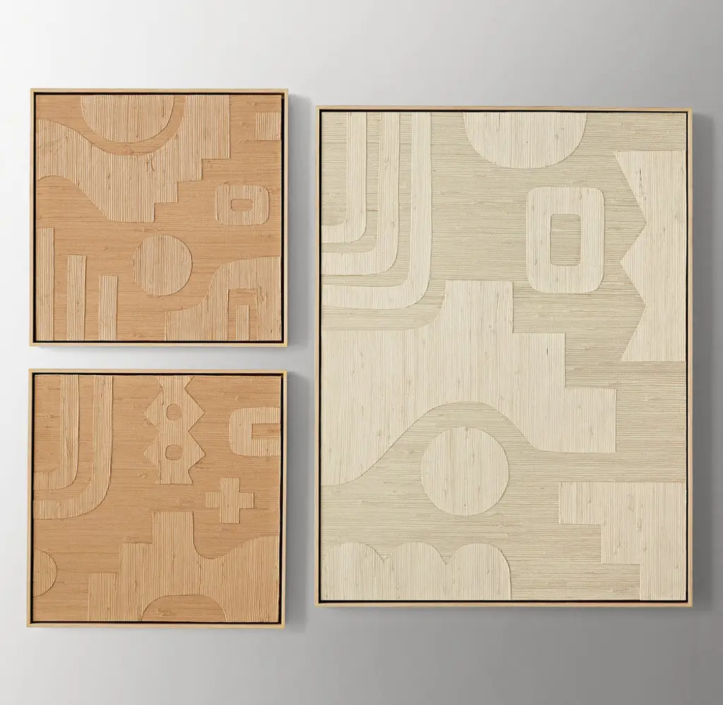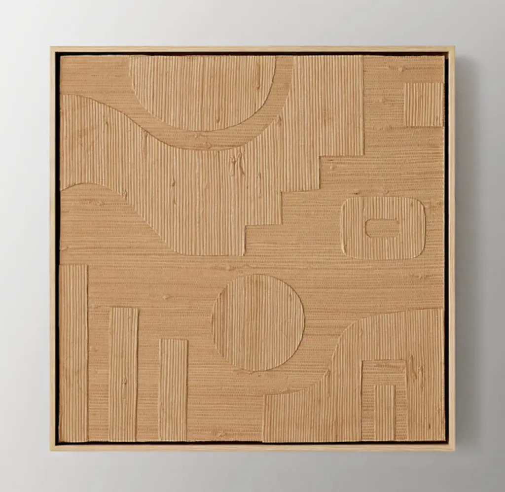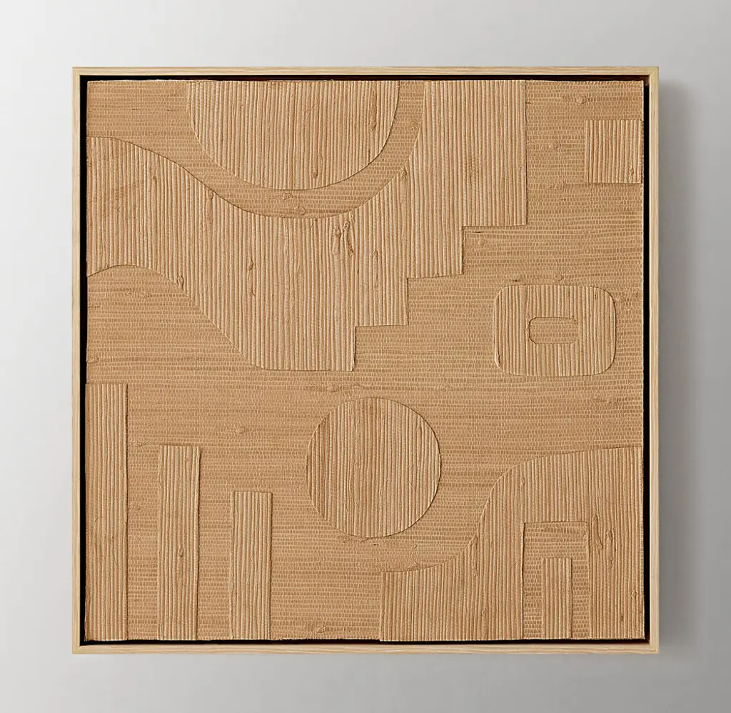 A longing for lazy beach days spent under the palms inspired Élan Byrd's playful wall art series. The dimensional canvas is handwoven of repurposed vintage grasscloth, presenting a collage of abstract shapes that conjure the sun, sea and sandy shores.