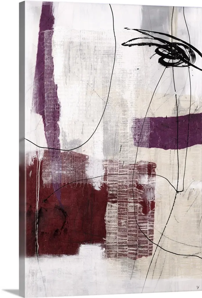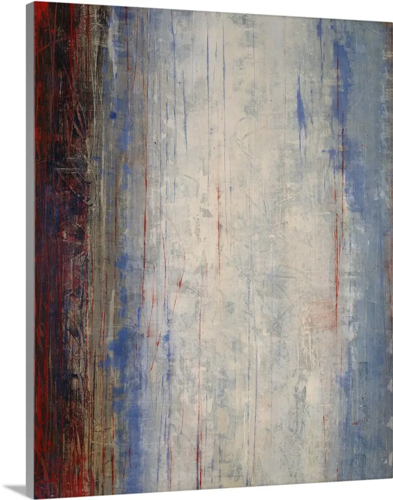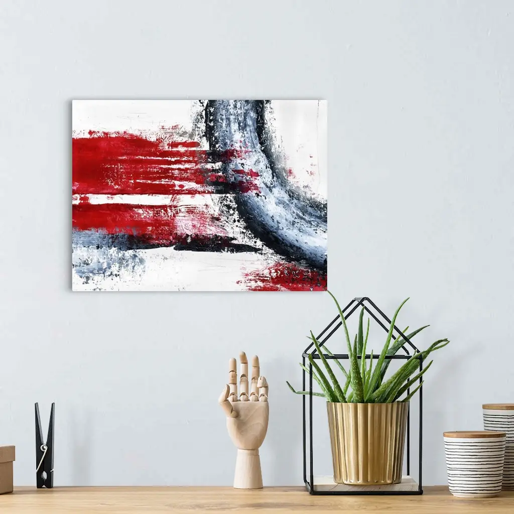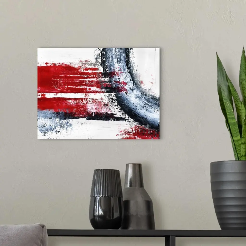 Bold, abstract painting with wide, bright red, horizontal brushstrokes and a curved black, gray, and white stroke connecting the side and top of the canvas.