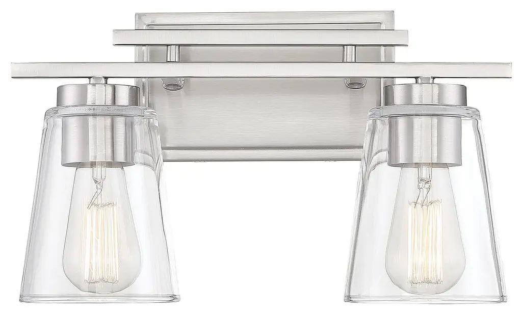 Upgrade your bathroom with the elegant Calhoun 2-Light Bathroom Vanity Light in Satin Nickel. This stunning fixture features a structured design with a gleaming satin nickel finish and clear glass shades, creating a luxurious look without breaking the bank. With its rectangular wall plate, bold-lined light bar, and chunky, cylindrical bulb sockets, this vanity light exudes a quiet confidence that will make a lasting impression in your bathroom. The brushed pewter-like satin nickel finish adds a touch of elegance and versatility, allowing you to easily match it with other silver-hued accessories or mix things up with black, nickel, brass, or brushed gold accents. Customize the look of your bathroom even further by choosing decorative bulbs to complement the clear glass shades. Whether you prefer a vintage-inspired Edison bulb or a modern LED option, the Calhoun vanity light provides the perfect canvas for your personal style. Transform your bathroom into a sophisticated oasis with the Calhoun 2-Light Bathroom Vanity Light. Upgrade your lighting and create a spa-like atmosphere that will leave you feeling relaxed and refreshed every day. Don't miss out on this affordable luxury - bring home the Calhoun vanity light today! This light requires 2 , 60W Watt Bulbs (Not Included) UL Certified.