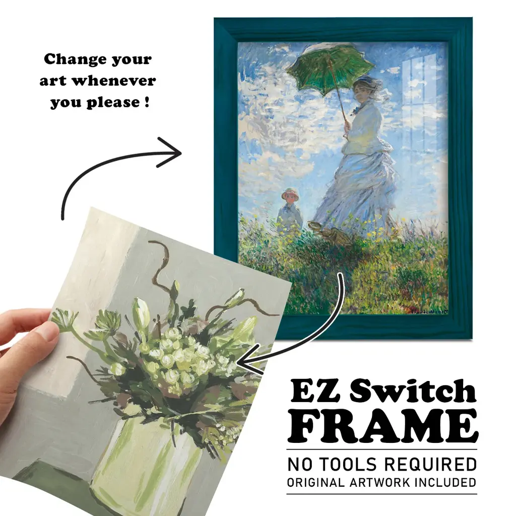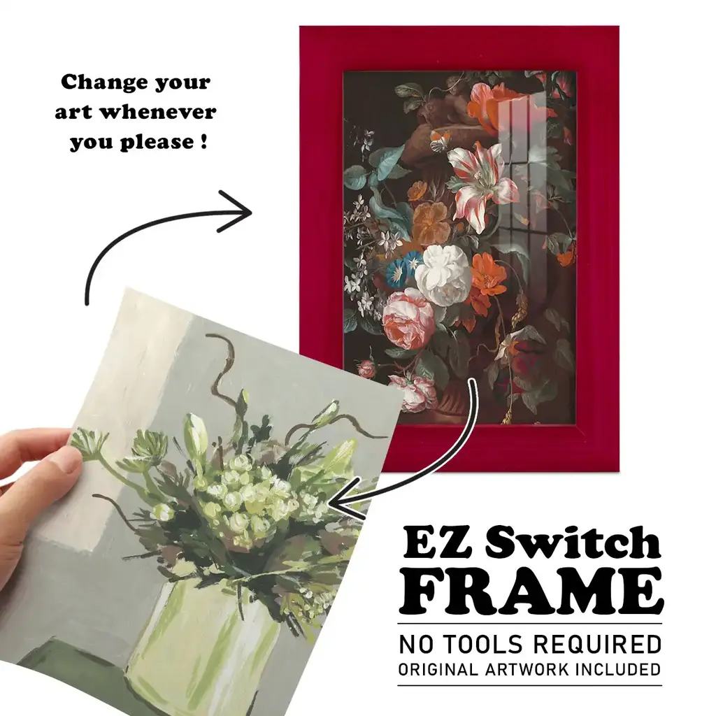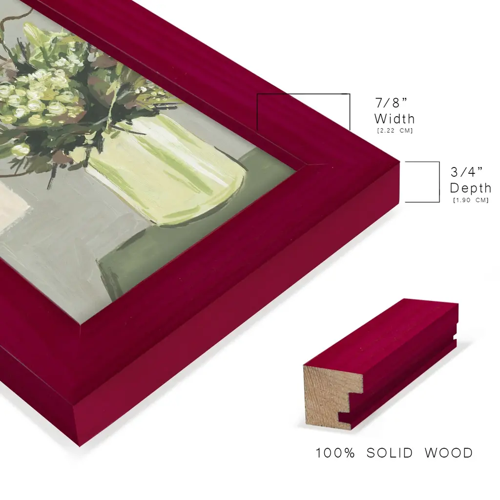 Elegant Floral I -EZ SWITCH Framed Print w/glass-Cherry Red A delightful, framed print. Featuring a solid wood frame with real wood glass. This premium print is giclee quality. In addition, every frame features a removable back and table top stand. This allows you to change your art in the future or to just stand the art on a table for a new look. We are sure you'll enjoy our new series of EZ SWITCH Framed Art. Solid Wood Frame Real Glass Removable / Replaceable Art Built in Tabletop Stand Sizes range from 4x6 up to 12x15 - buy just one or pair them up as sets as you see fit.