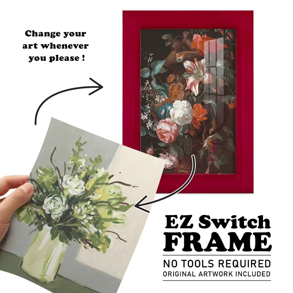Elegant Floral II -EZ SWITCH Framed Print w/glass-Cherry Red A delightful, framed print. Featuring a solid wood frame with real wood glass. This premium print is giclee quality. In addition, every frame features a removable back and table top stand. This allows you to change your art in the future or to just stand the art on a table for a new look. We are sure you'll enjoy our new series of EZ SWITCH Framed Art. Solid Wood Frame Real Glass Removable / Replaceable Art Built in Tabletop Stand Sizes range from 4x6 up to 12x15 - buy just one or pair them up as sets as you see fit.