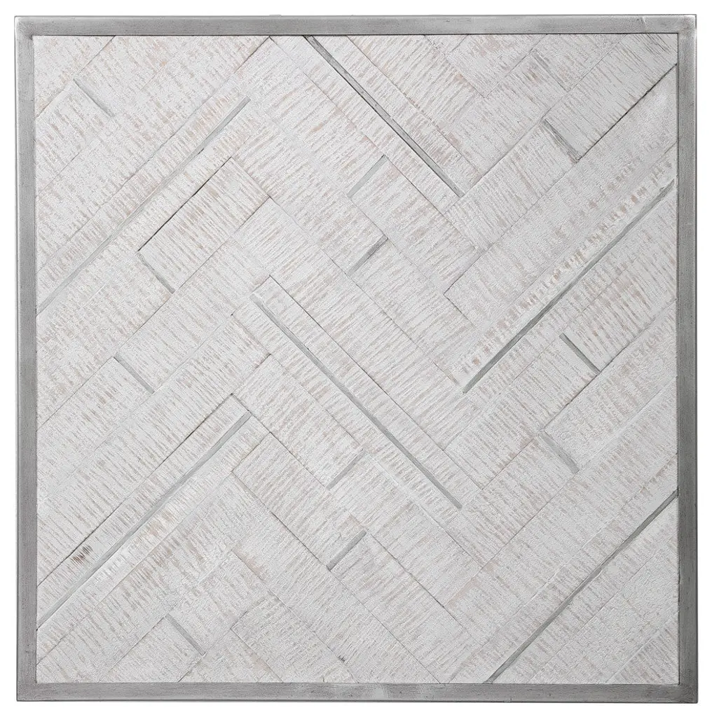 This Wood Wall Panel Personifies Modern Coastal Style With Whitewashed Pine Wood In A Classic Herringbone Pattern Accented By Sleek Silver Bar Inserts. Each Piece Is Paired With A Distressed Brushed Silver Frame And May Be Hung Horizontal Or Vertical.• 24" square x 2" deep. Weighs 14 lbs.• Hand Finished Wood• May be hung vertically or horizontally. Properly weighted hanging hardware attached.• Heirloom Quality - Expertly hand crafted and hand finished. Due to the hand crafted nature of this piece, each piece may have subtle differences.