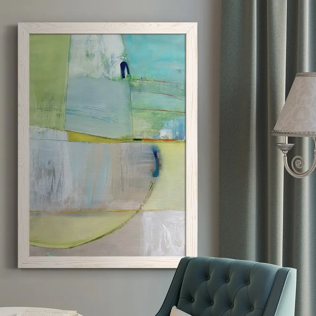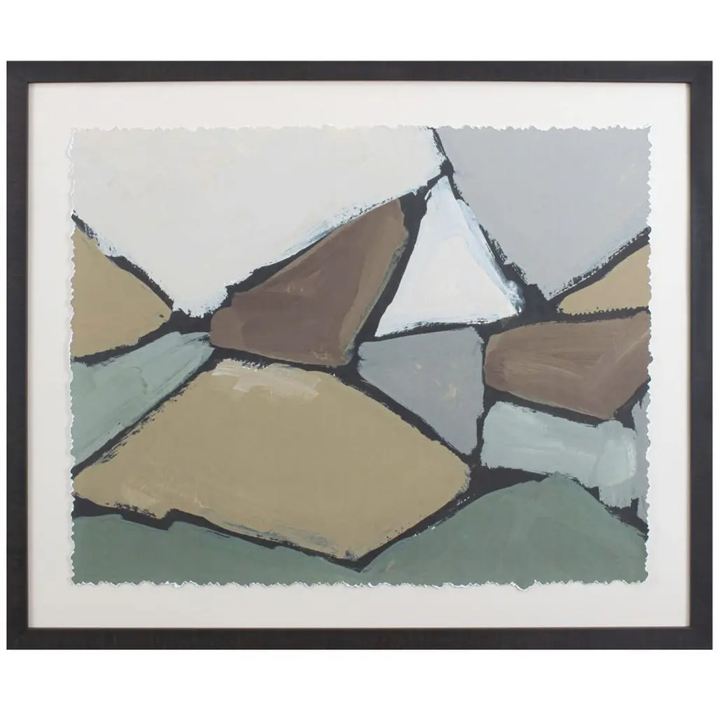 Handcrafted giclee on paper, this abstract artwork is floated on a hand-wrapped raw canvas mat with a muted silver frame. Comes ready to hand with single-wire hardware.