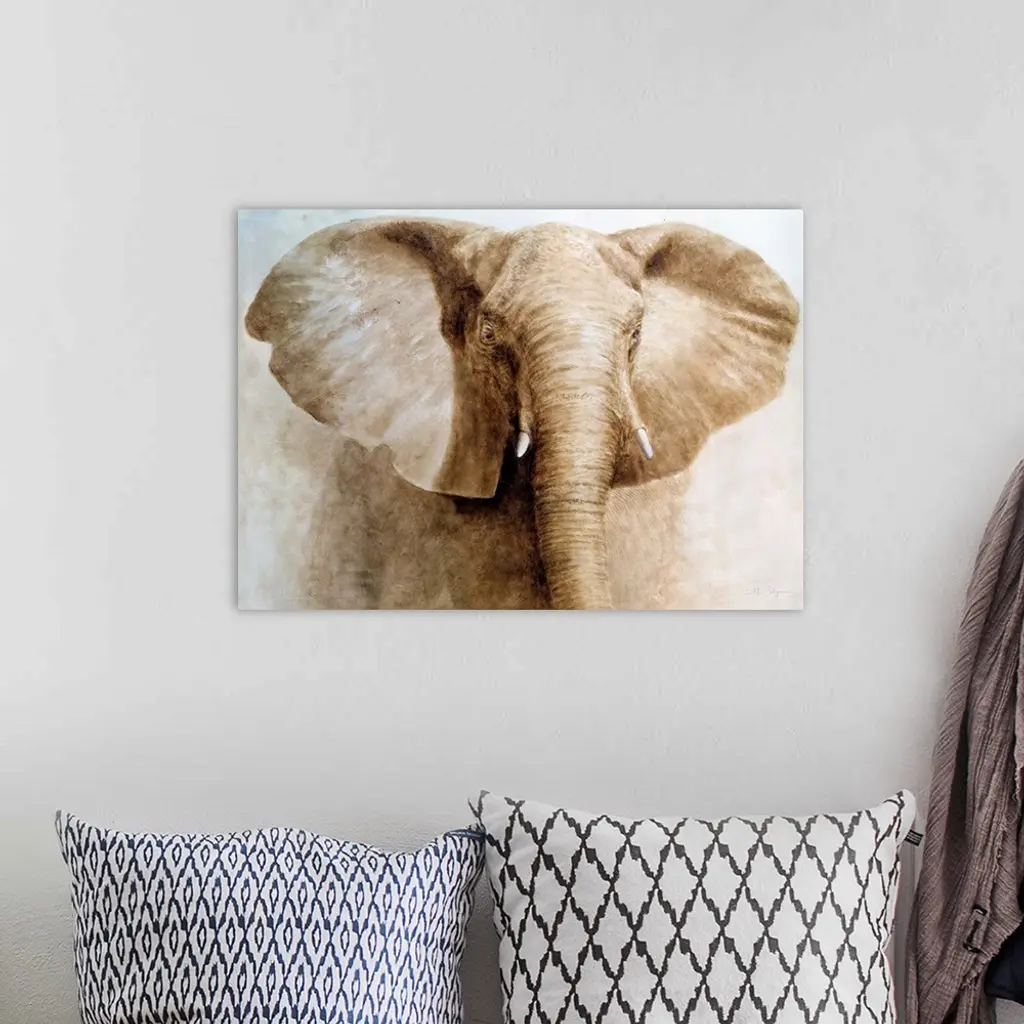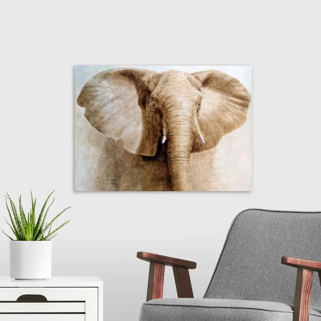 Contemporary painting of animal with large ears and trunk with short ivory tusks.
