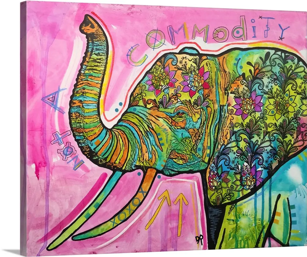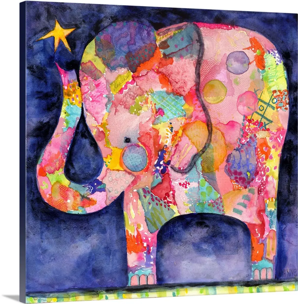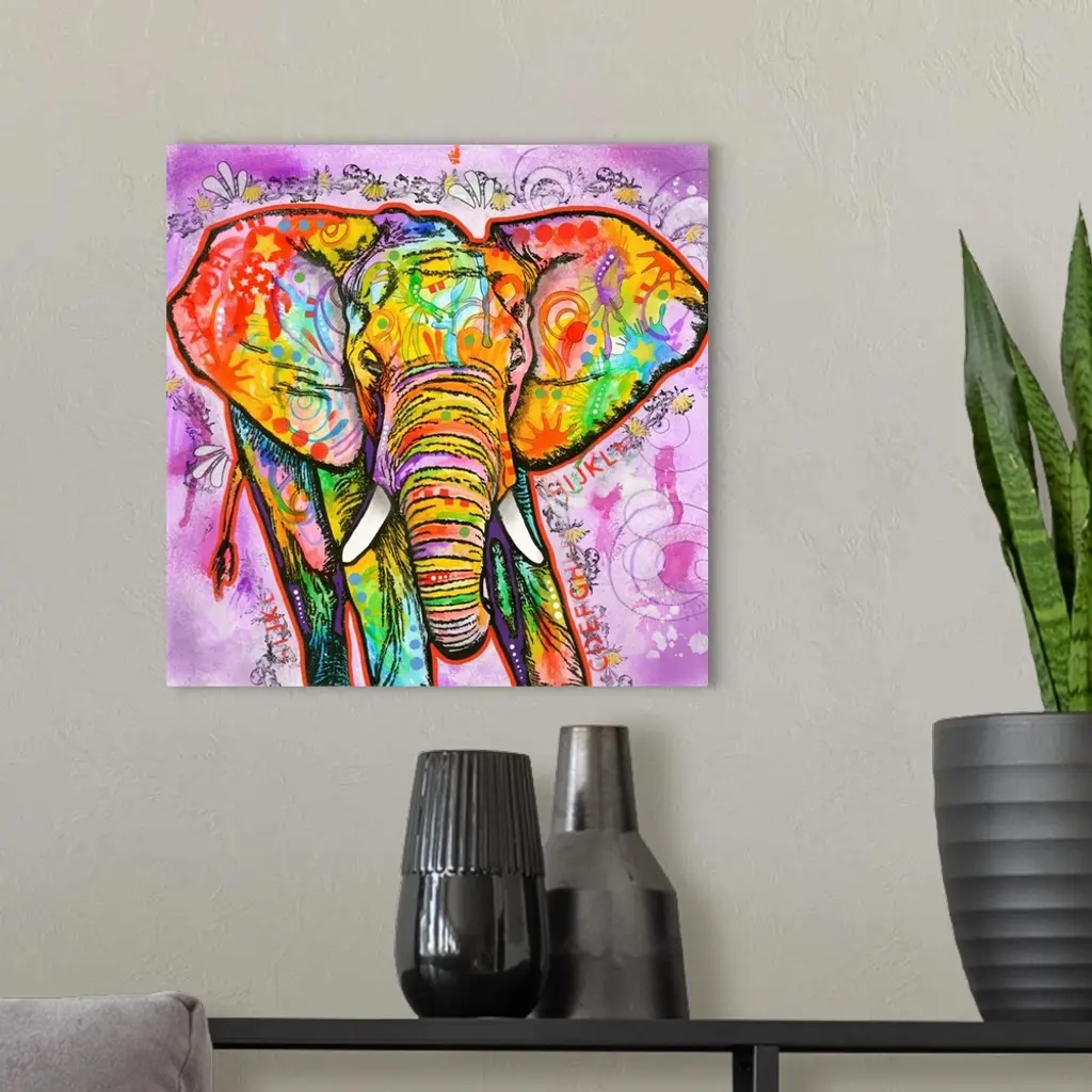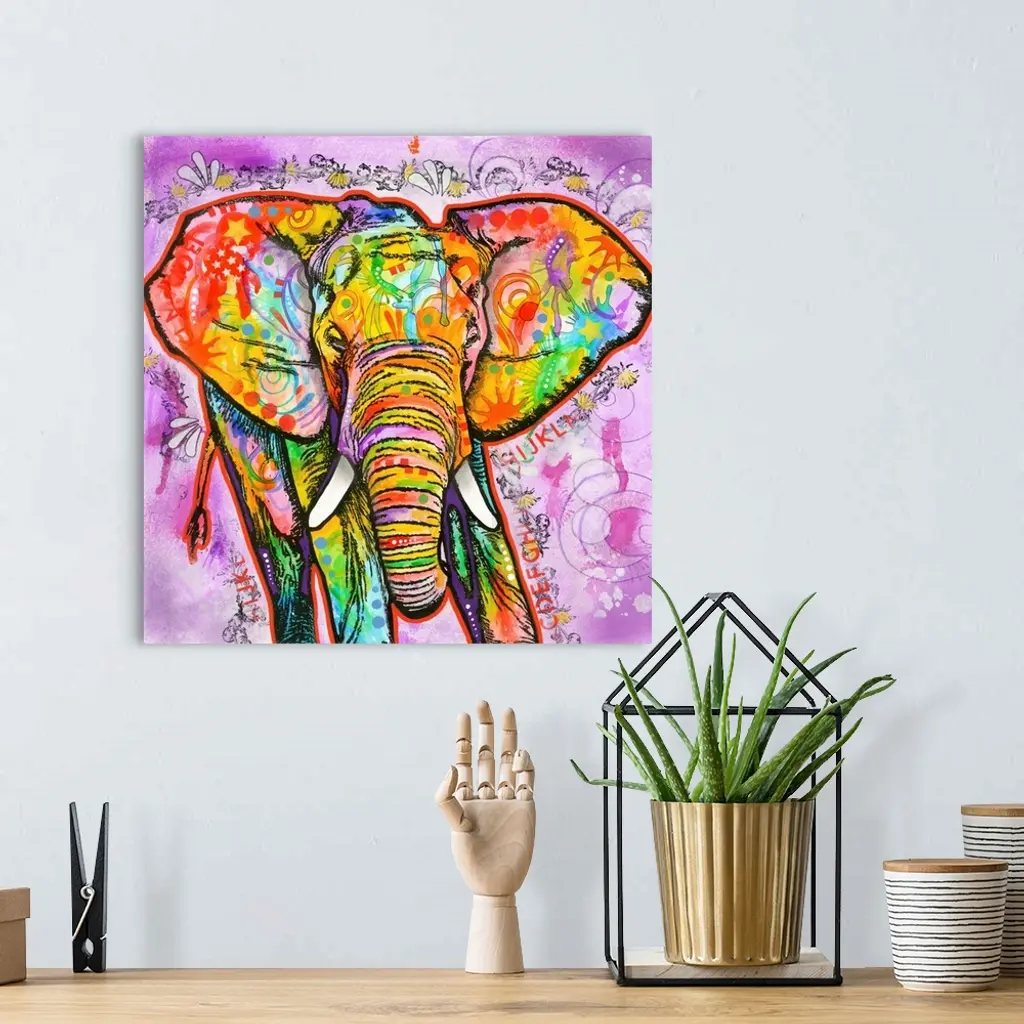 Square painting of a colorful elephant with abstract markings on a busy purple background.