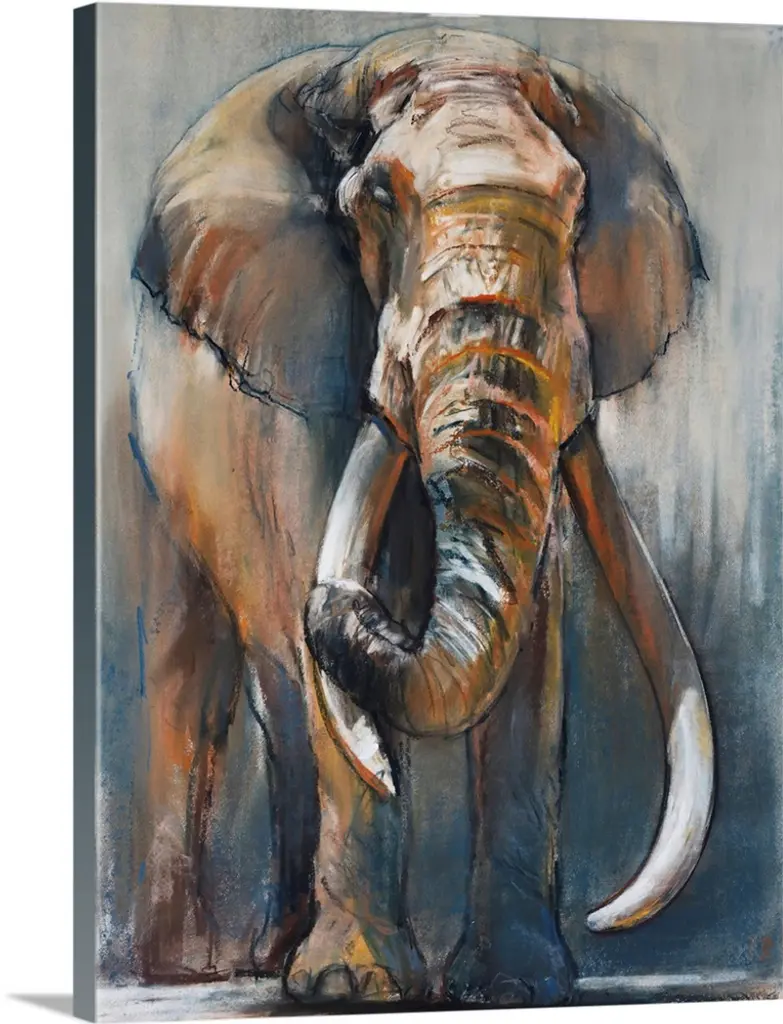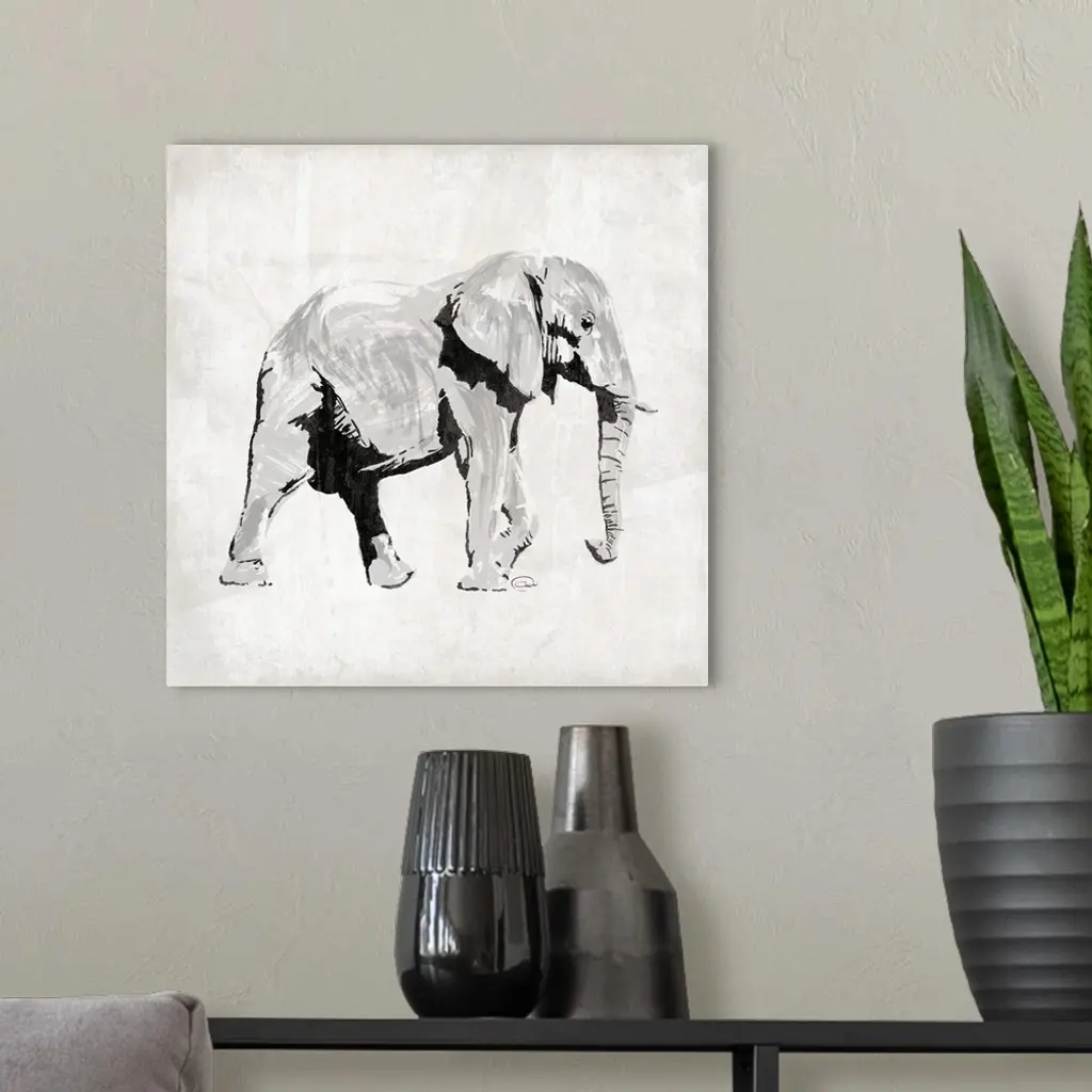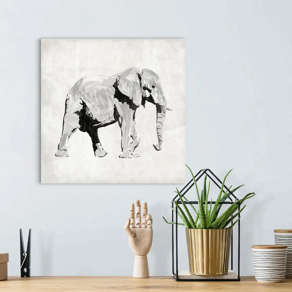 Contemporary piece of artwork with elephant facing the right lifting its left front front leg as if about to walk.