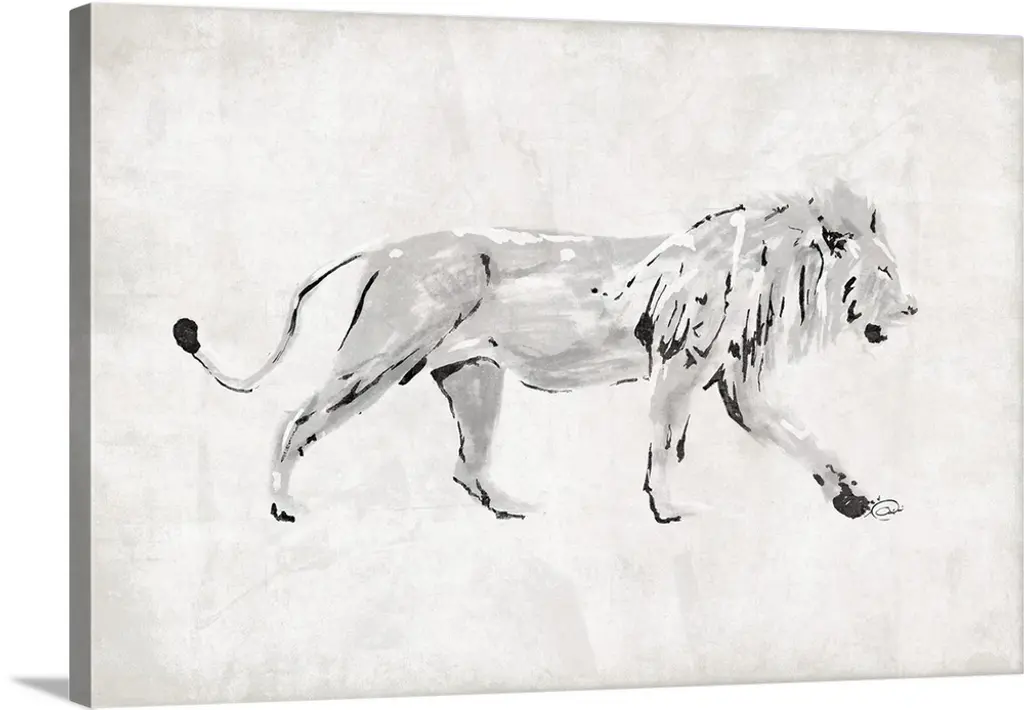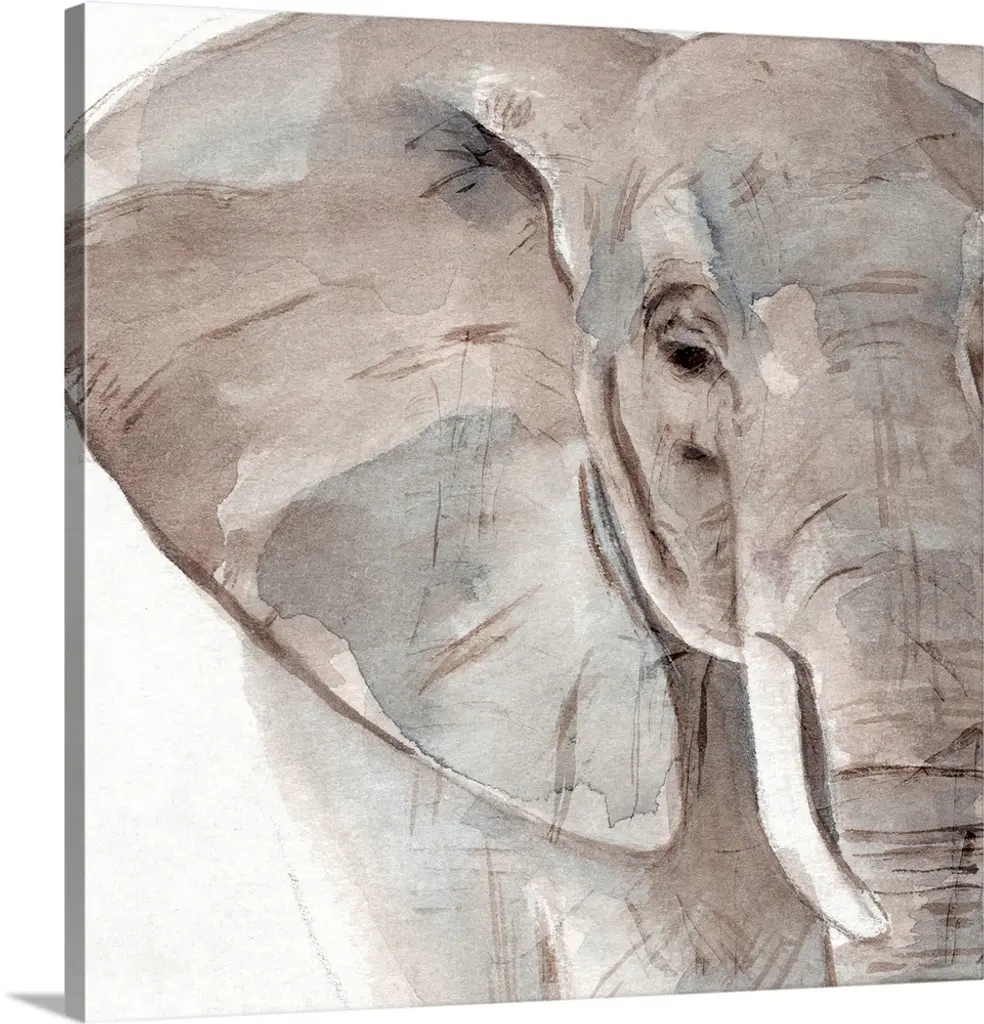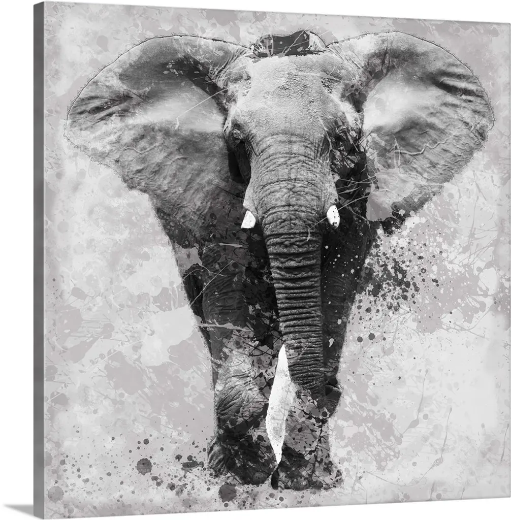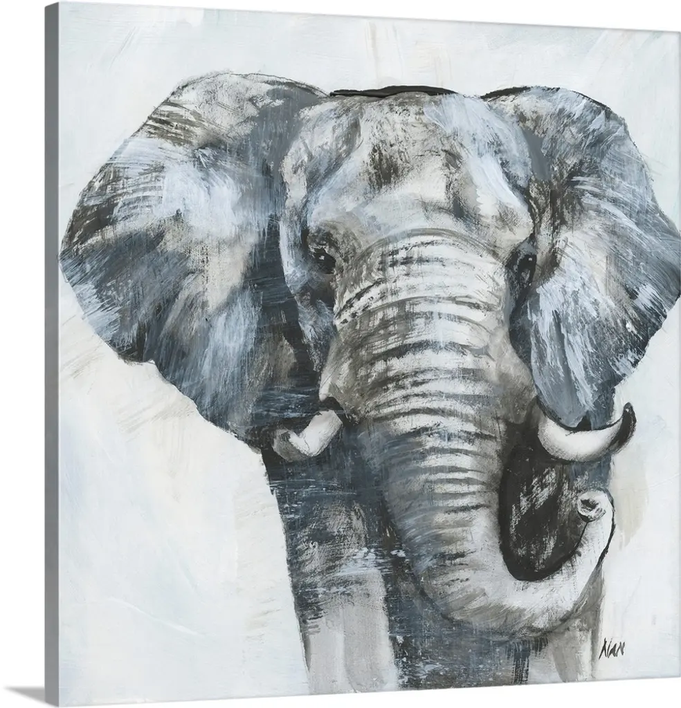 Contemporary piece of artwork with elephant facing the right lifting its left front front leg as if about to walk.