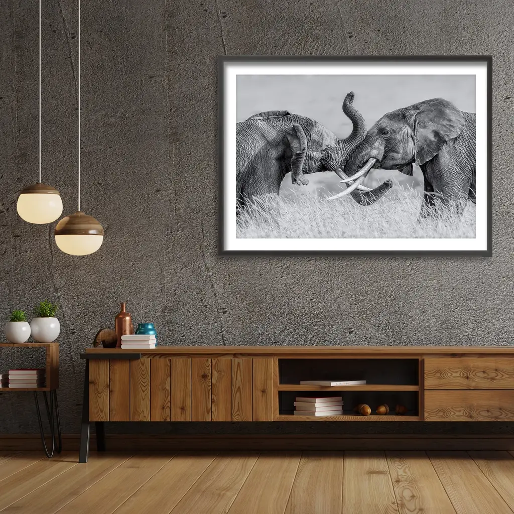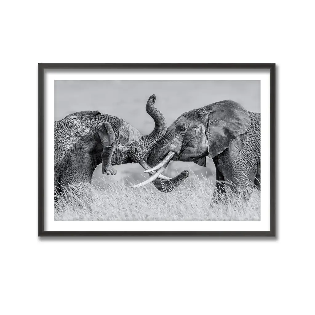 Infuse any space with the essence of this beautifully captured framed print photograph titled "Elephant Tai Chi" by Jun Zuo. This piece features two mighty elephants fighting in the savannah in monochromatic tones to complete any modern space. Handcrafted in Chattanooga, Tennessee, by Ready2HangArt using a locally sourced artist print, finished with a rear hanger for simple installation.