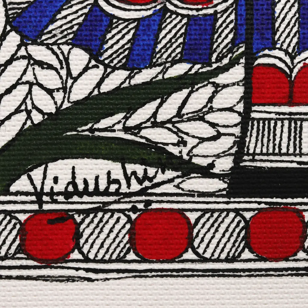 Indian artist Vidushini creates an endearing folk painting of two elephants adorned with bright and colorful robes that meet by a magnificent tree after many years and greet each other with passion and enthusiasm. The sparkle and joy in their eyes show the intensity of their love and friendship. Vidushini expertly applies acrylic paint to handmade paper in the classic Madhubani style, resulting in a unique palette of meticulously selected hues, including grey, blue, light blue, red, orange, yellow, white, green and black.