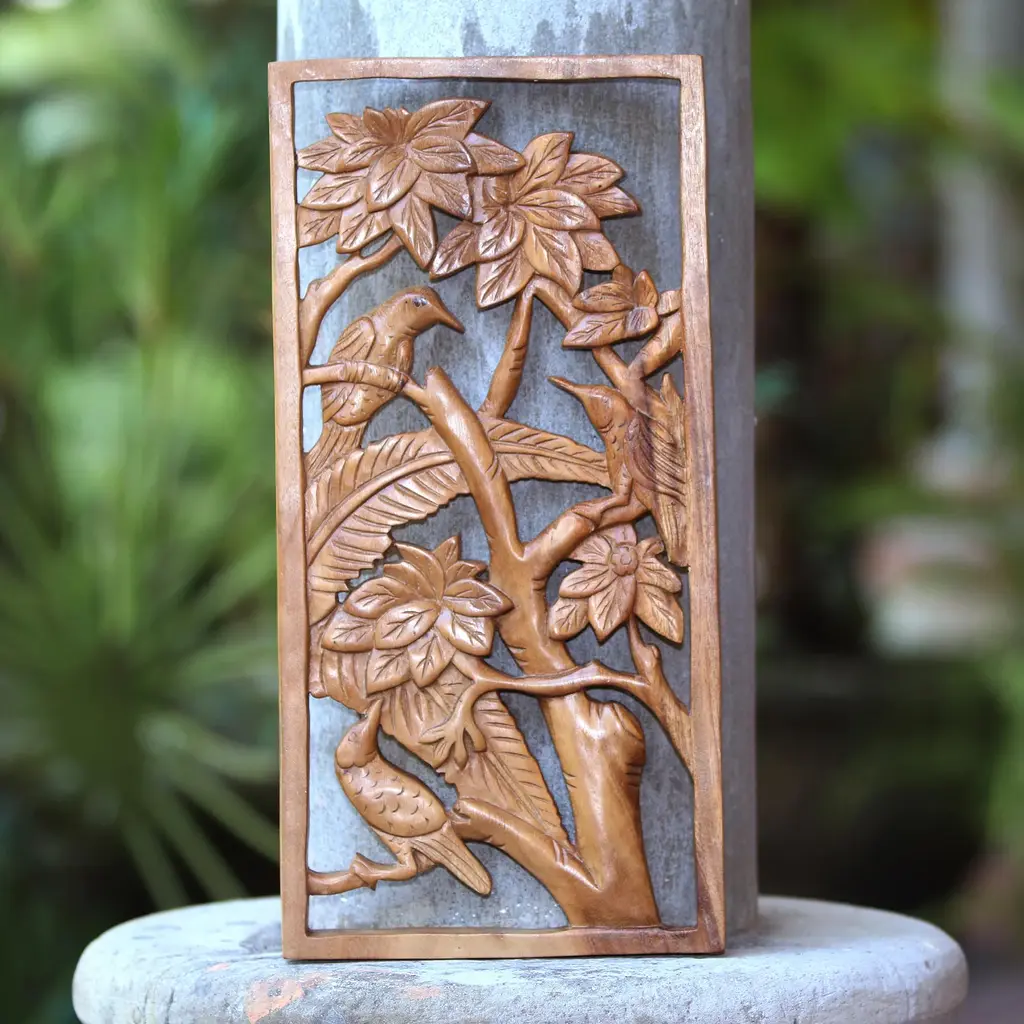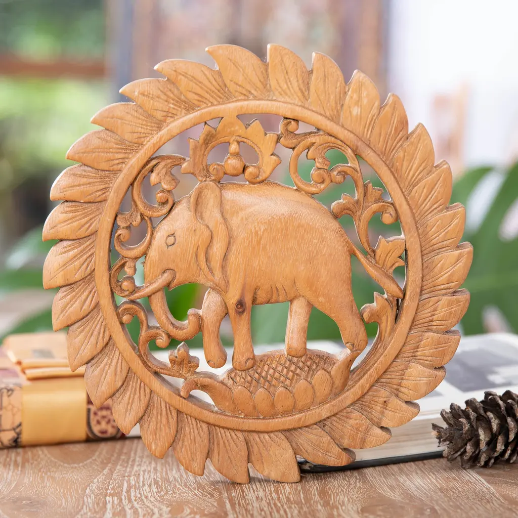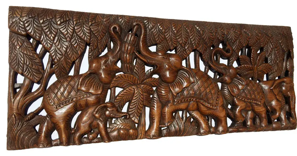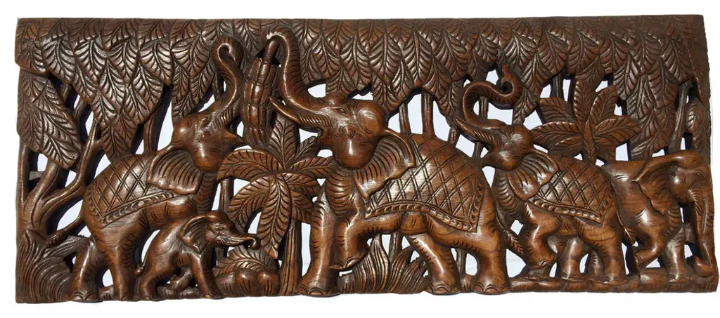 Elephant family wood carving wall panel. Perfect wood wall sculpture to decorate any room in your home. Made from teak wood. A product of Thailand that expresses a wonderful home decorative ambiance.SIZE • WEIGHT • COLOR• MATERIALHeight: 35.5" InchesWidth: 13.5" InchesThickness: 1" InchesWeight: 8.0 lbsColor: Brown Material: Teak Wood