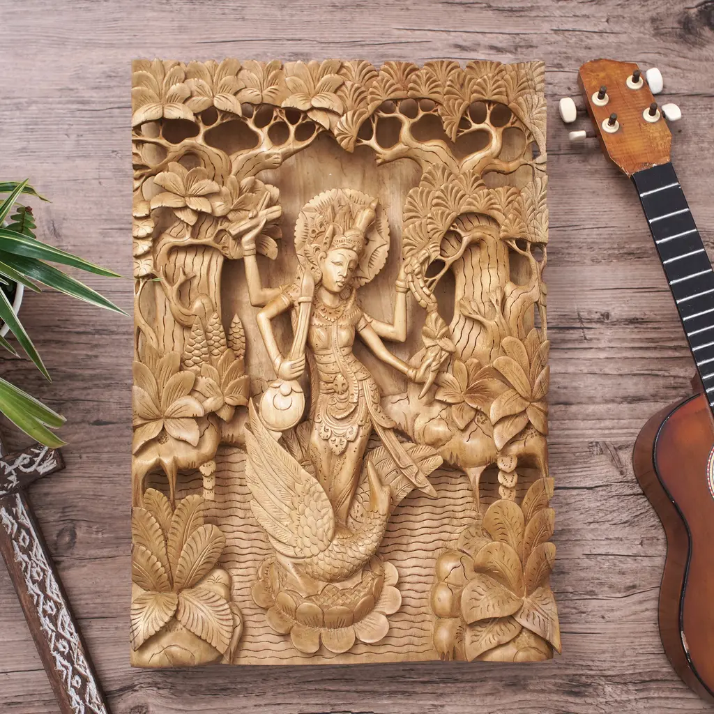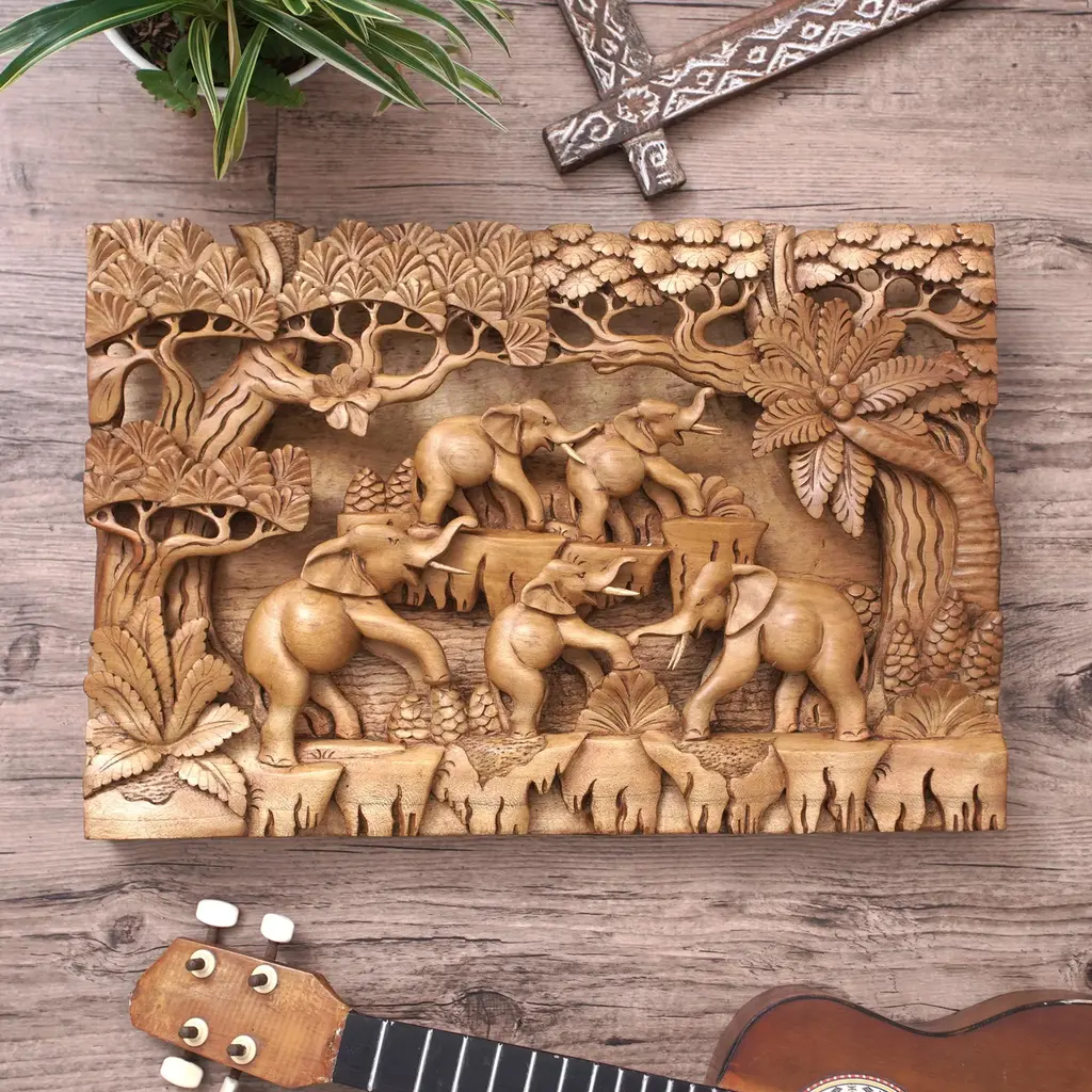 Elephants In Forest Wood Carved Wall Panel, Tropical Asiana Home Decor