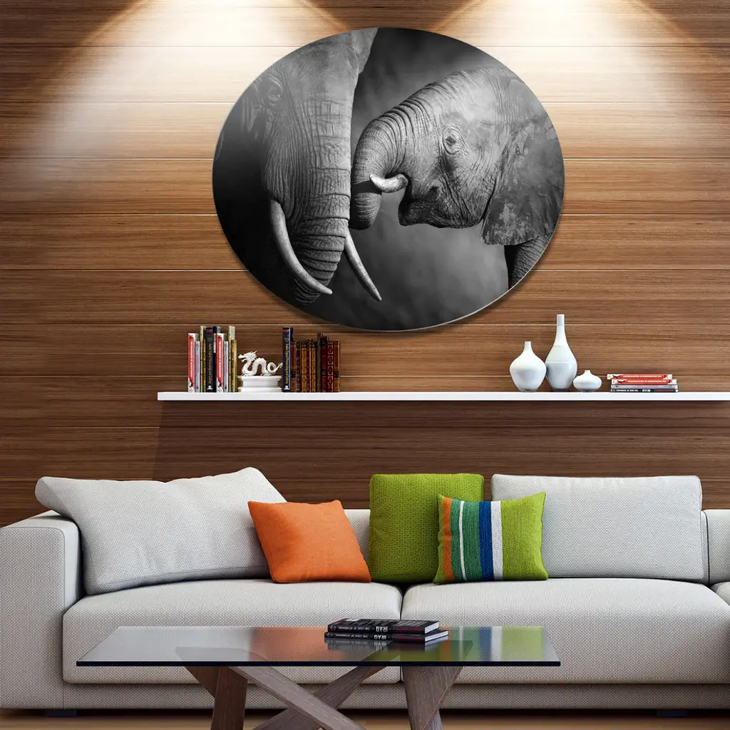 Bring Contemporary Abstraction to your home with this large Circle Metal wall art. This Elephants Showing Affection Metal Artwork makes it the focal point of any room or office. - White Gloss Coating ensures colors are extra vibrant with light reflection.- Aluminum grade Sheet Metal with 1 inch mounting frame on the back giving the illusion that the artwork is floating on the wall..- Mounting Brackets are included along with instructions.- High Quality Digital images are created directly into a glossy aluminum panel producing a stunning and captivating print into the glossy finish of the metal.- Water, Fire and Scratch resistant HD Aluminum panels.- Looks better than any photo paper and guaranteed to last at least 20 years- Easy to clean with a microfiber cloth. Colors are far superior to regular Canvas Art. - Easy to Hang