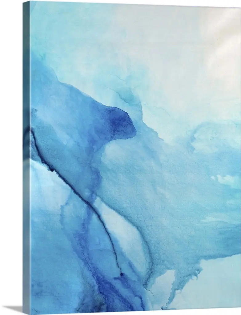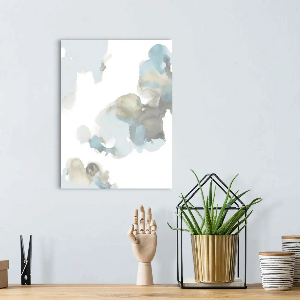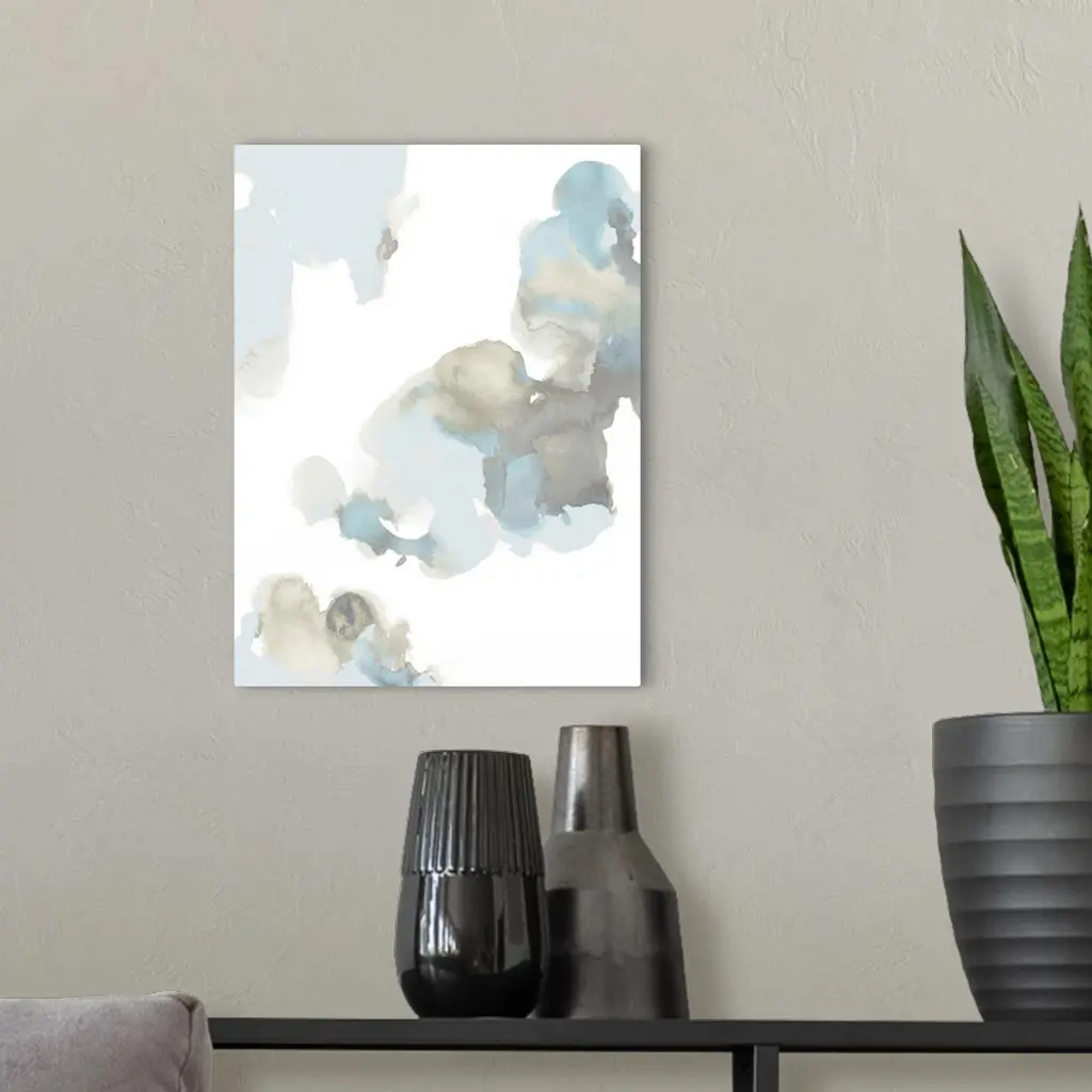 Abstract painting with light blue and gray hues splattered together on a white background.