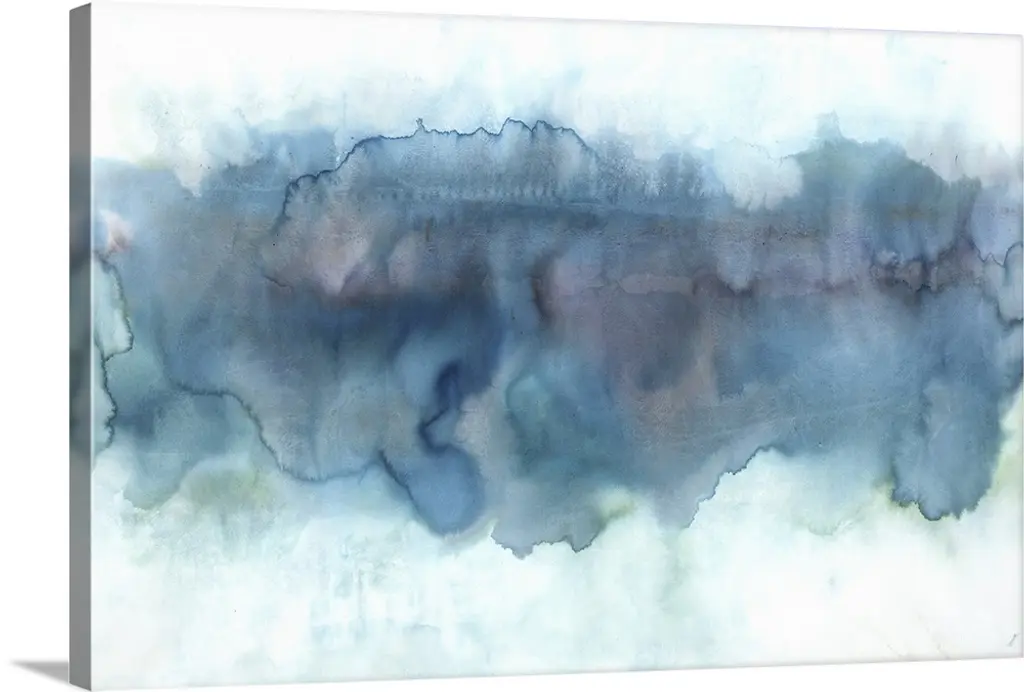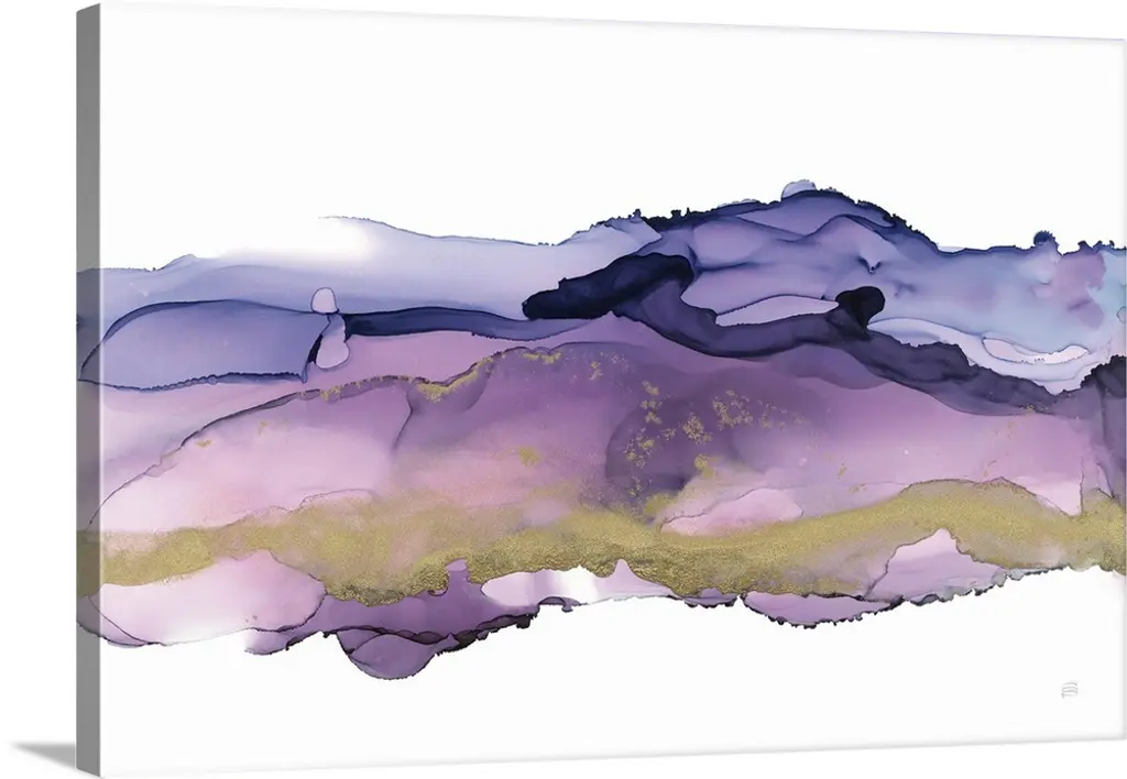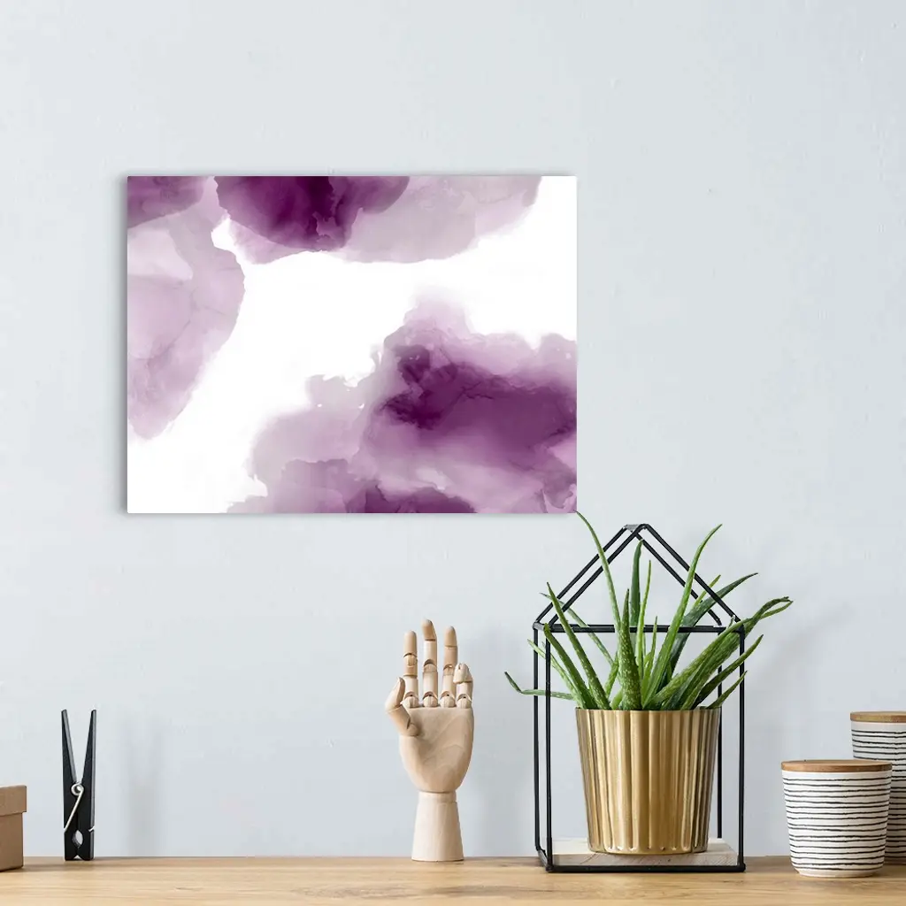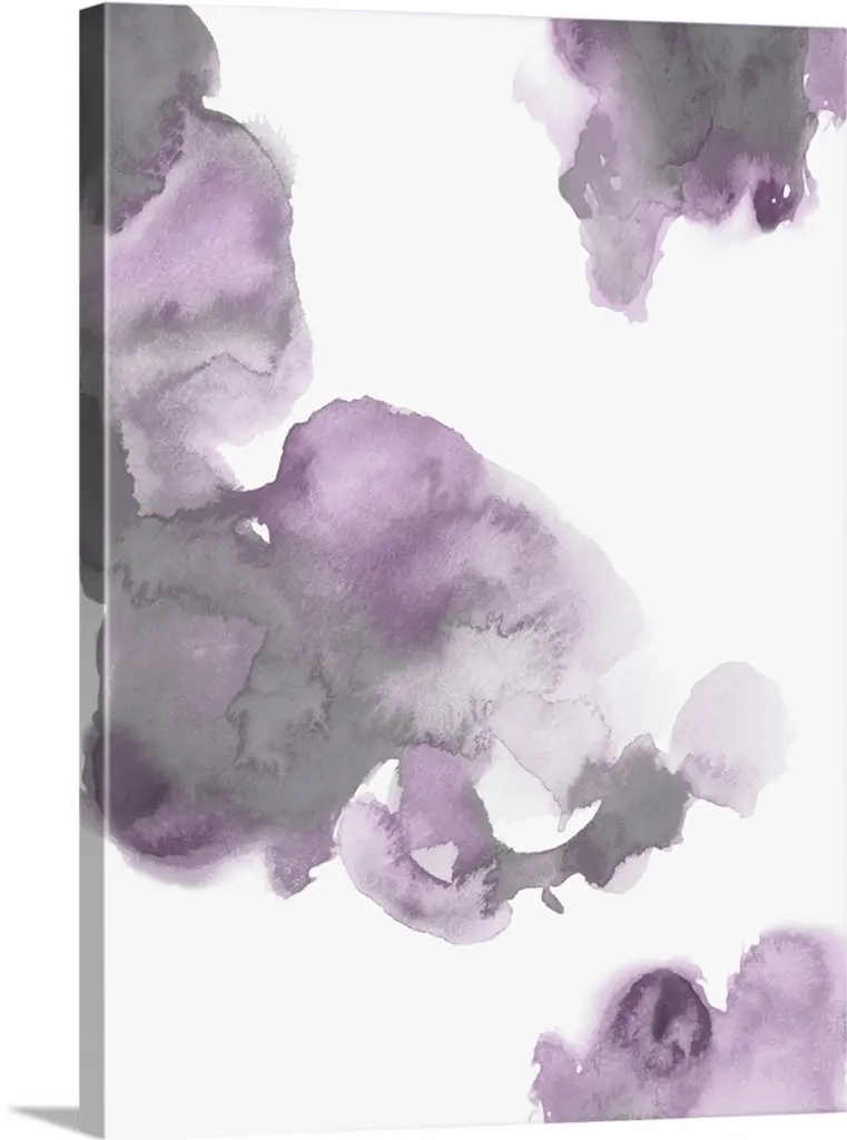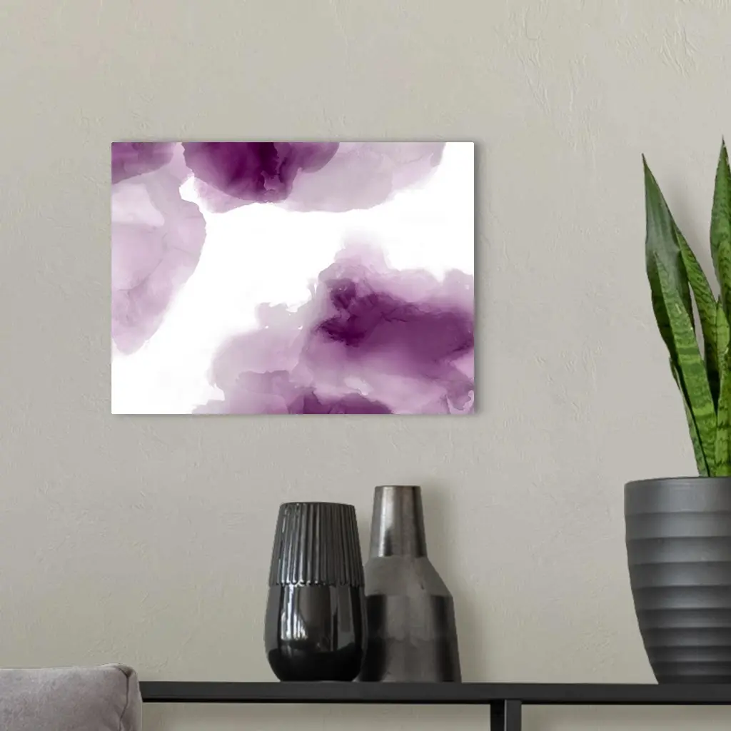 Abstract painting with amethyst purple hues splattered together on a white background.