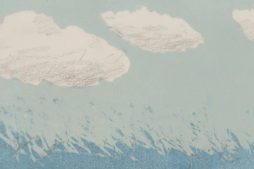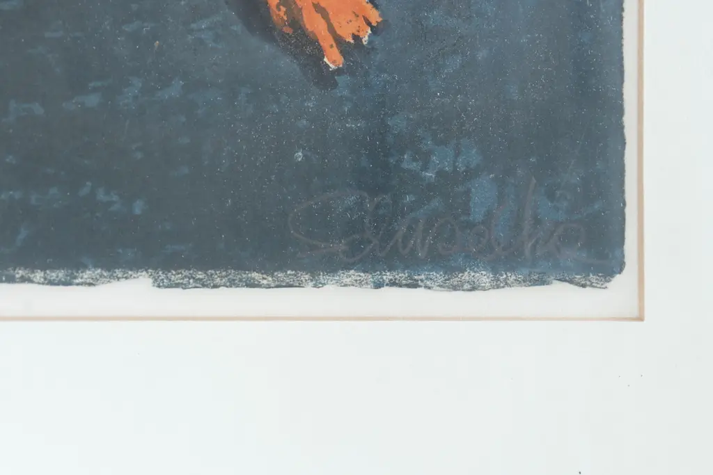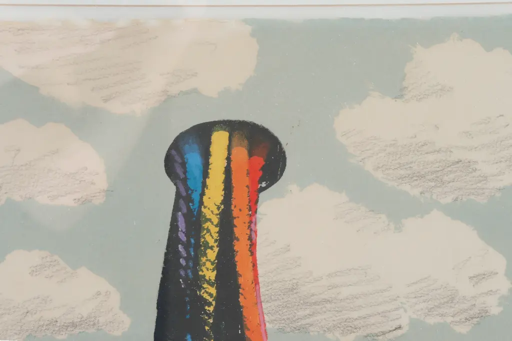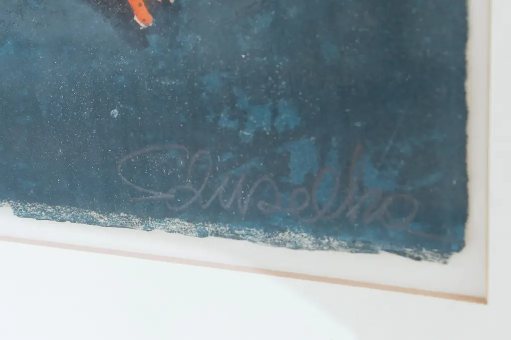 An original hand signed lithograph by listed Austrian artist Elfi Schuselka (b. 1940). The abstract scene depicts six different colored ropes descending from a black hole in a cumulus filled blue sky over a vague teal horizon. Signed in pencil in the lower right. This piece was showcased in the Aesthetic Realism Foundation��s ‘Surface to Begin With����� Exhibition that ran from December 2011 to November 2012.