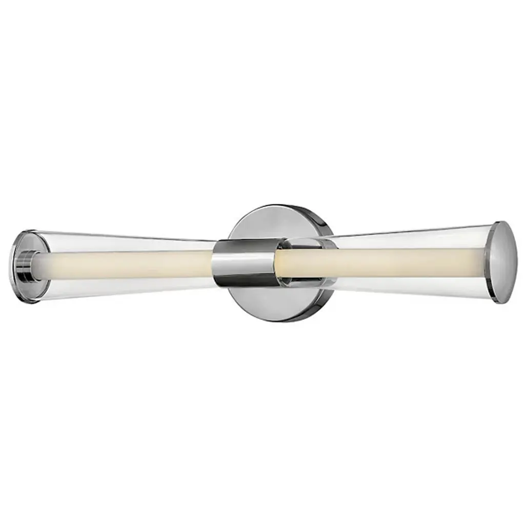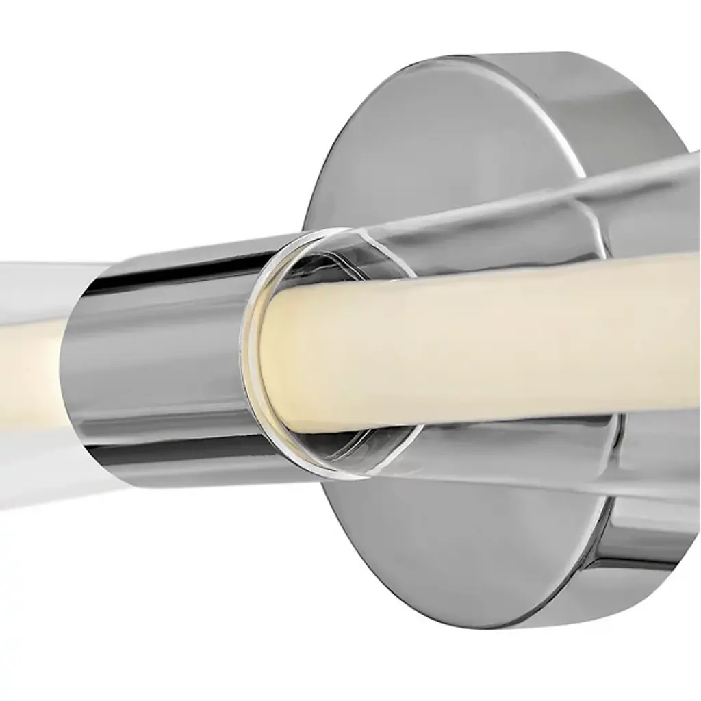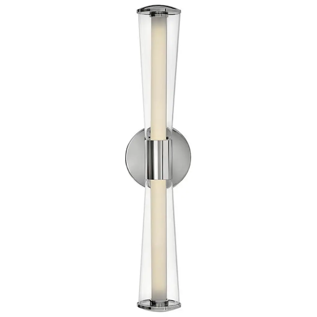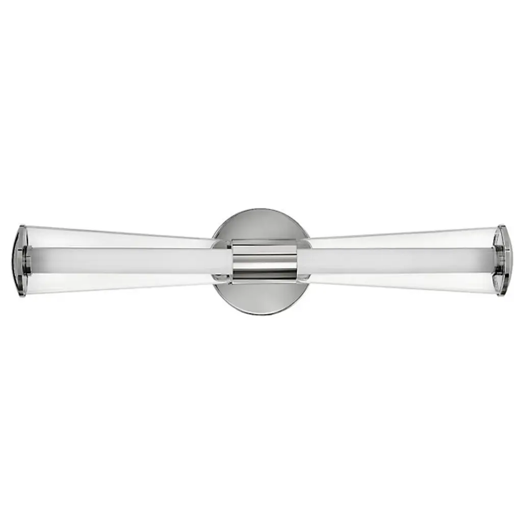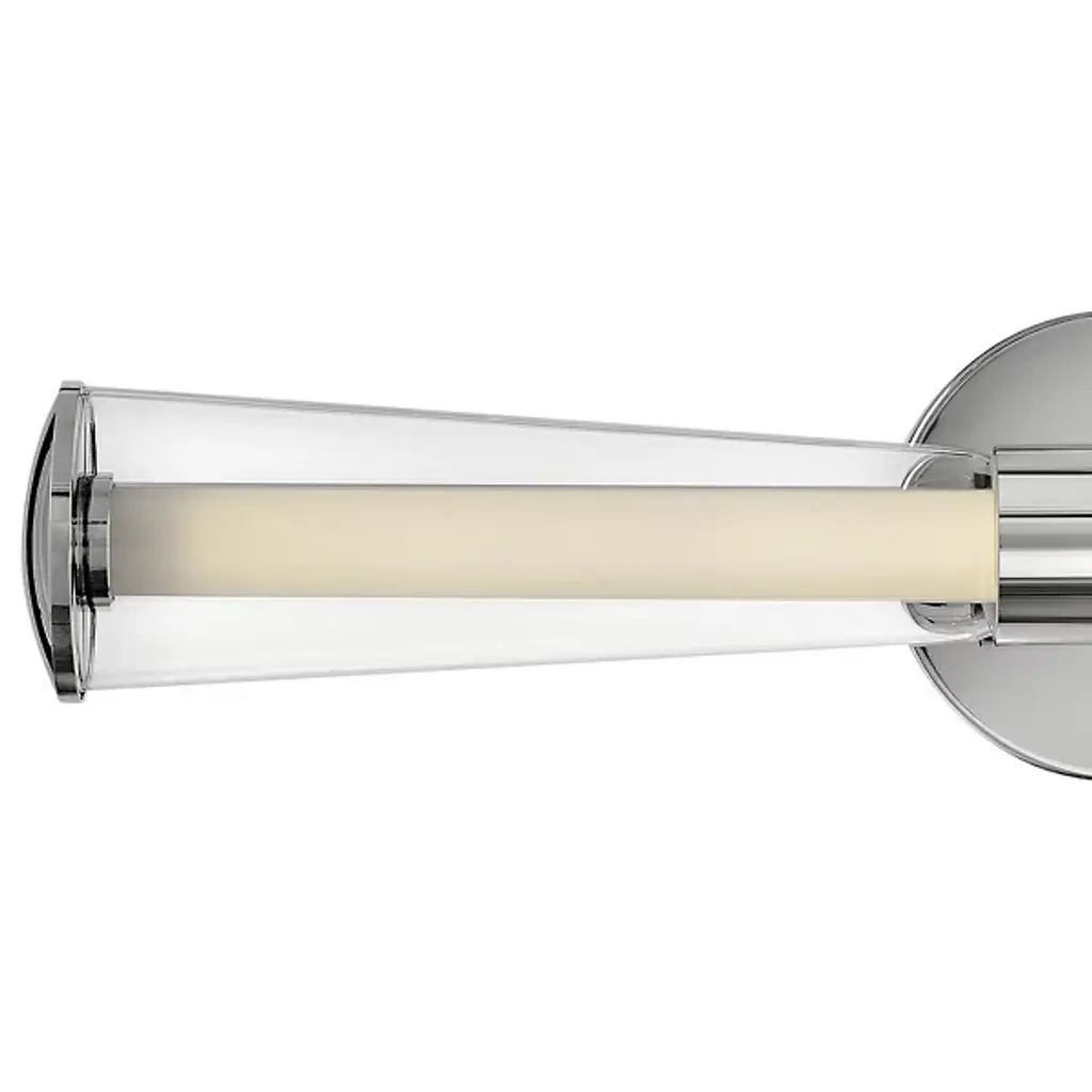 The Elin LED Vanity Light from Hinkley Lighting pairs with the home's clean contemporary aesthetic through its linear shapes and light. It grabs one's attention with a trumpet-shaped glass shade that showcases opaque LED lamping inside. The supporting compact backplate fits the piece in tight areas looking for vertical or horizontal mounting. The simple accents, uniform light, and contrasting colors at play make this a piece suited for refined interiors.