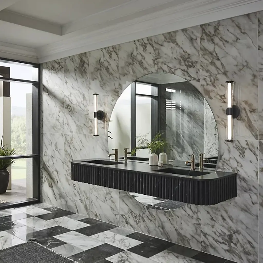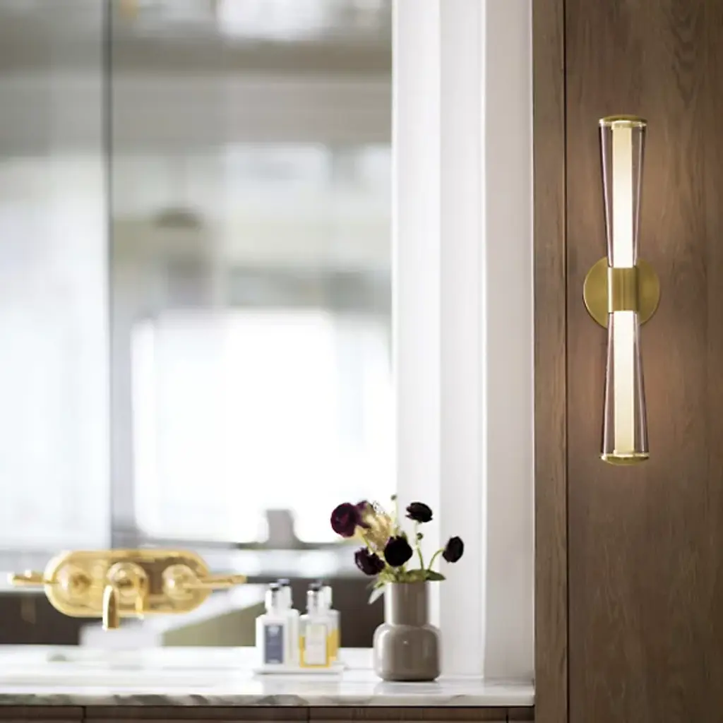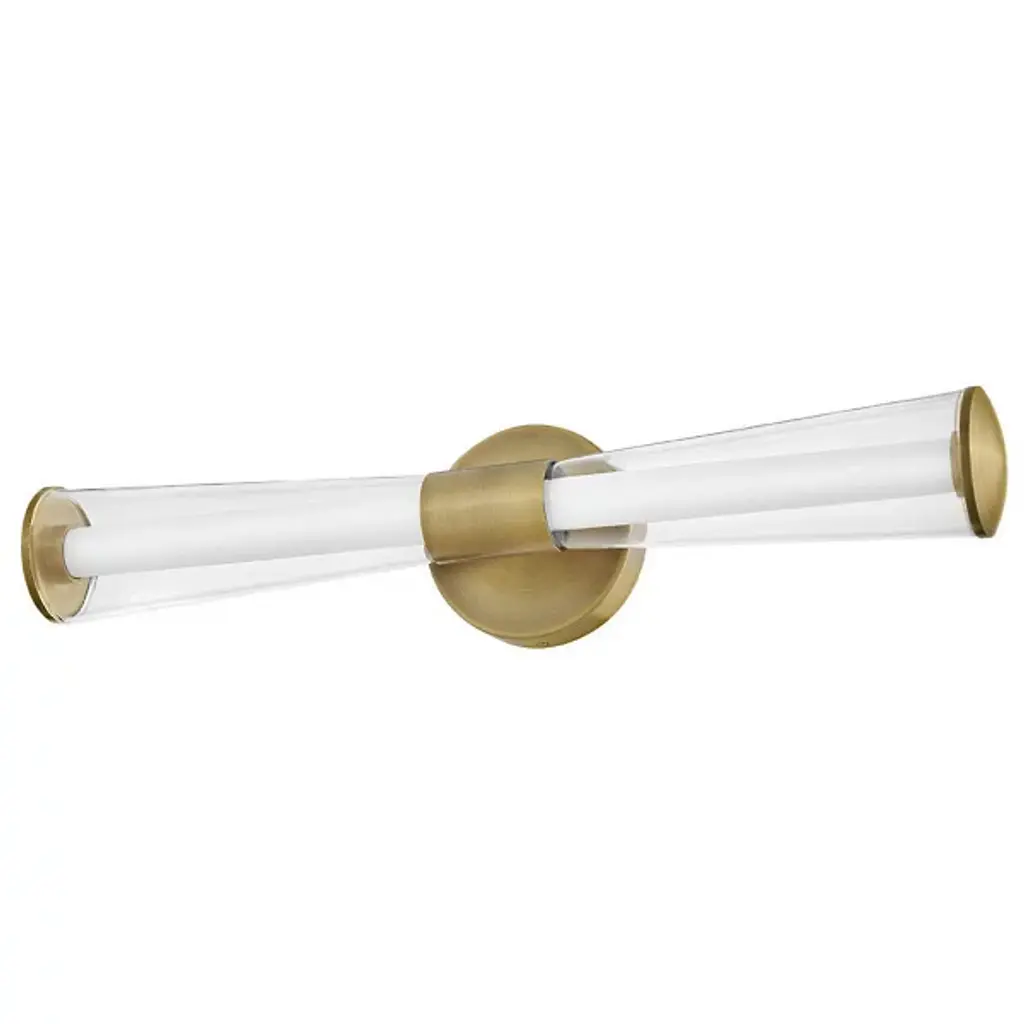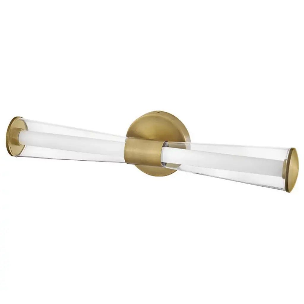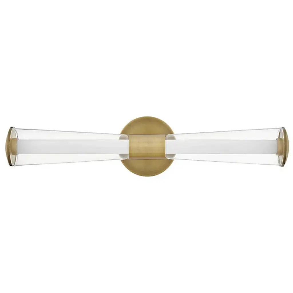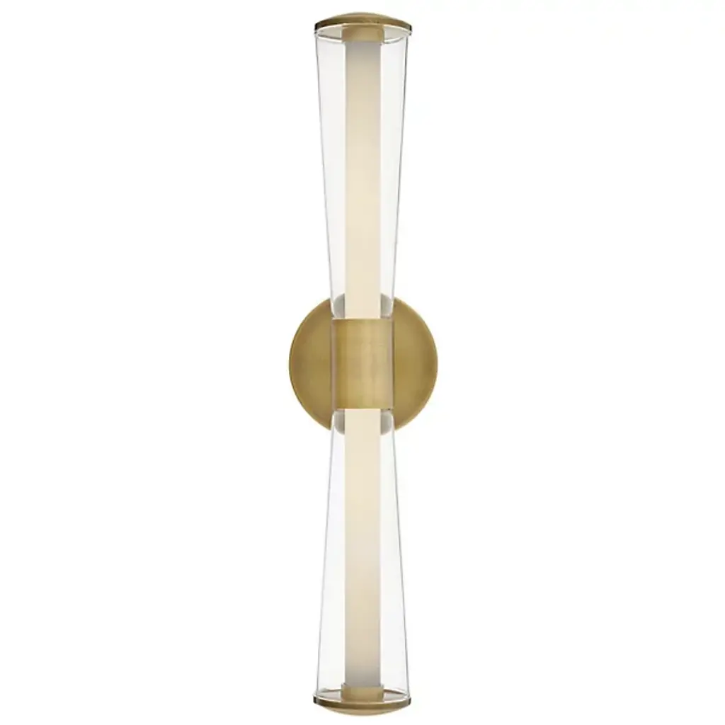 The Elin LED Vanity Light from Hinkley Lighting pairs with the home's clean contemporary aesthetic through its linear shapes and light. It grabs one's attention with a trumpet-shaped glass shade that showcases opaque LED lamping inside. The supporting compact backplate fits the piece in tight areas looking for vertical or horizontal mounting. The simple accents, uniform light, and contrasting colors at play make this a piece suited for refined interiors.