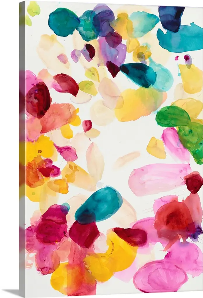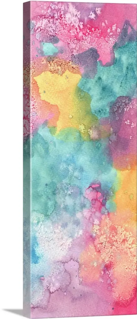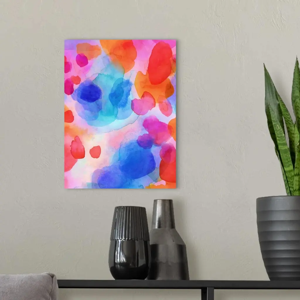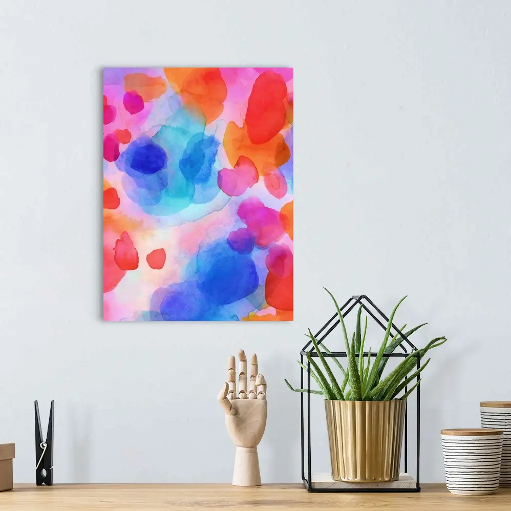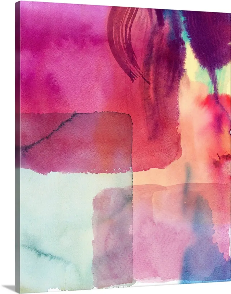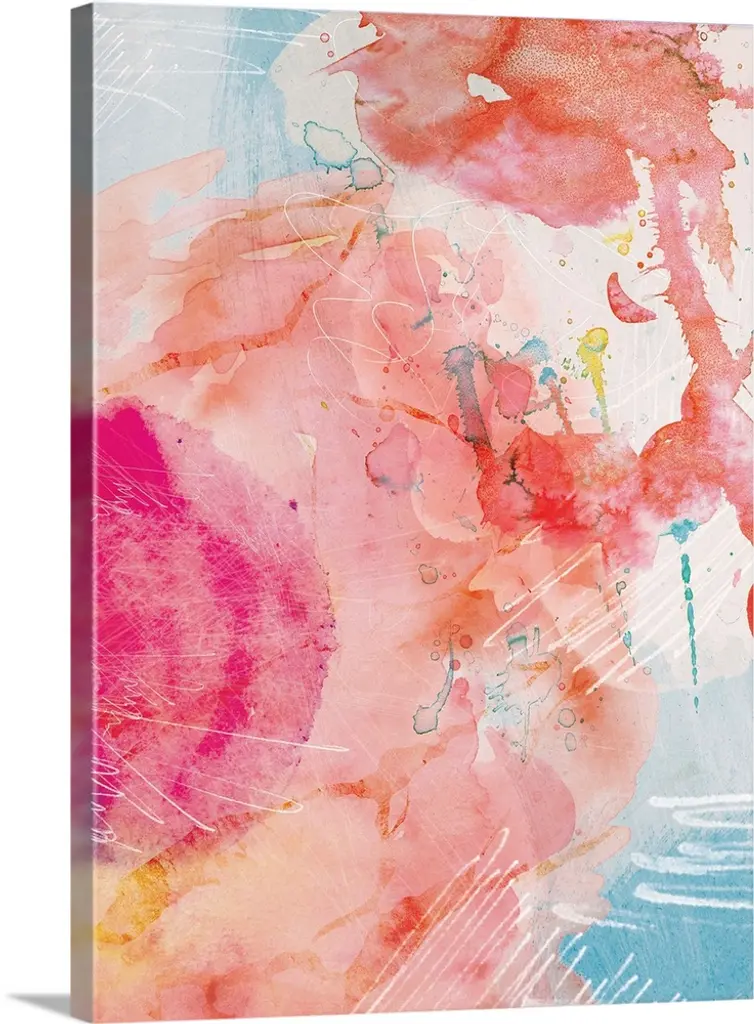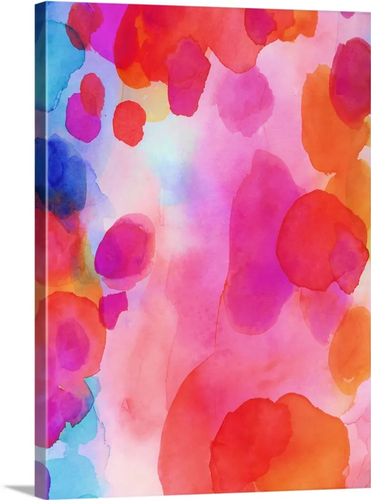 A vertical abstract watercolor painting in brilliant colors of pink, orange and blue.