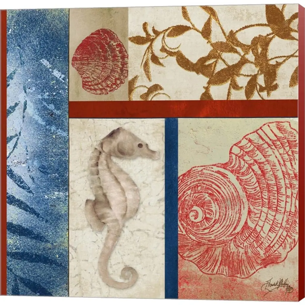 Nautical Surroundings Squares I by Elizabeth Medley is a high quality piece of canvas artwork. The finished size of this piece is 12" X 12", and it has a depth 1.5" with colonialred painted sides. There is a UV protective coating over the entire image, and it is ready to hang on your wall with no hardware required. 100% Satisfaction Guaranteed.