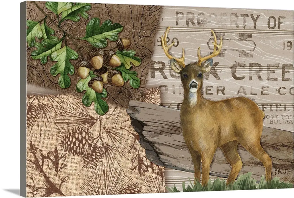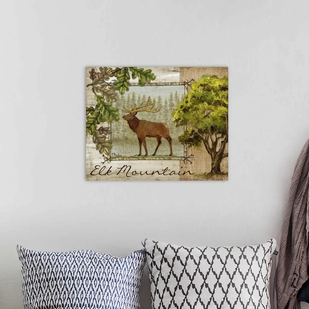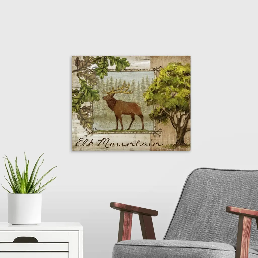Decorative artwork of an elk in a frame, with oak leaves, acorns, and the words Elk Mountain