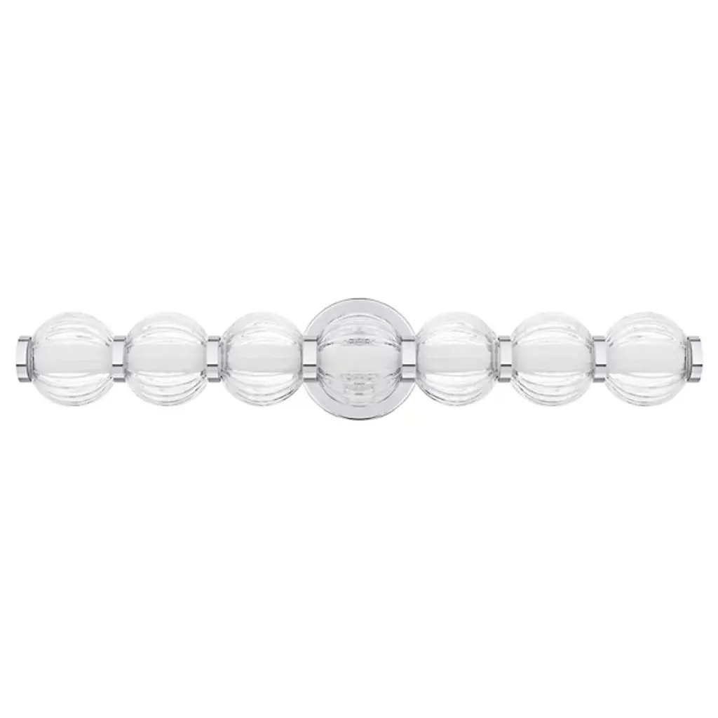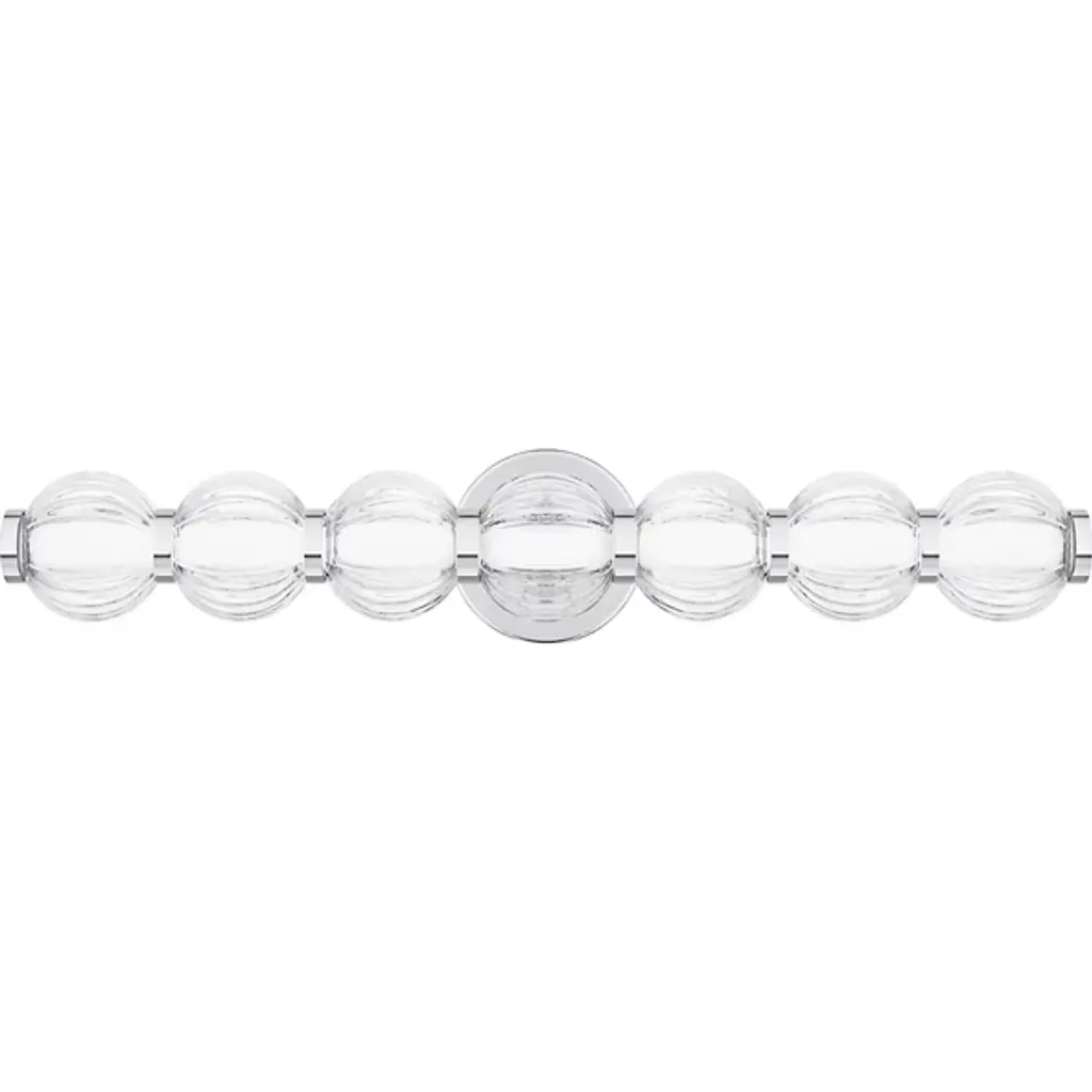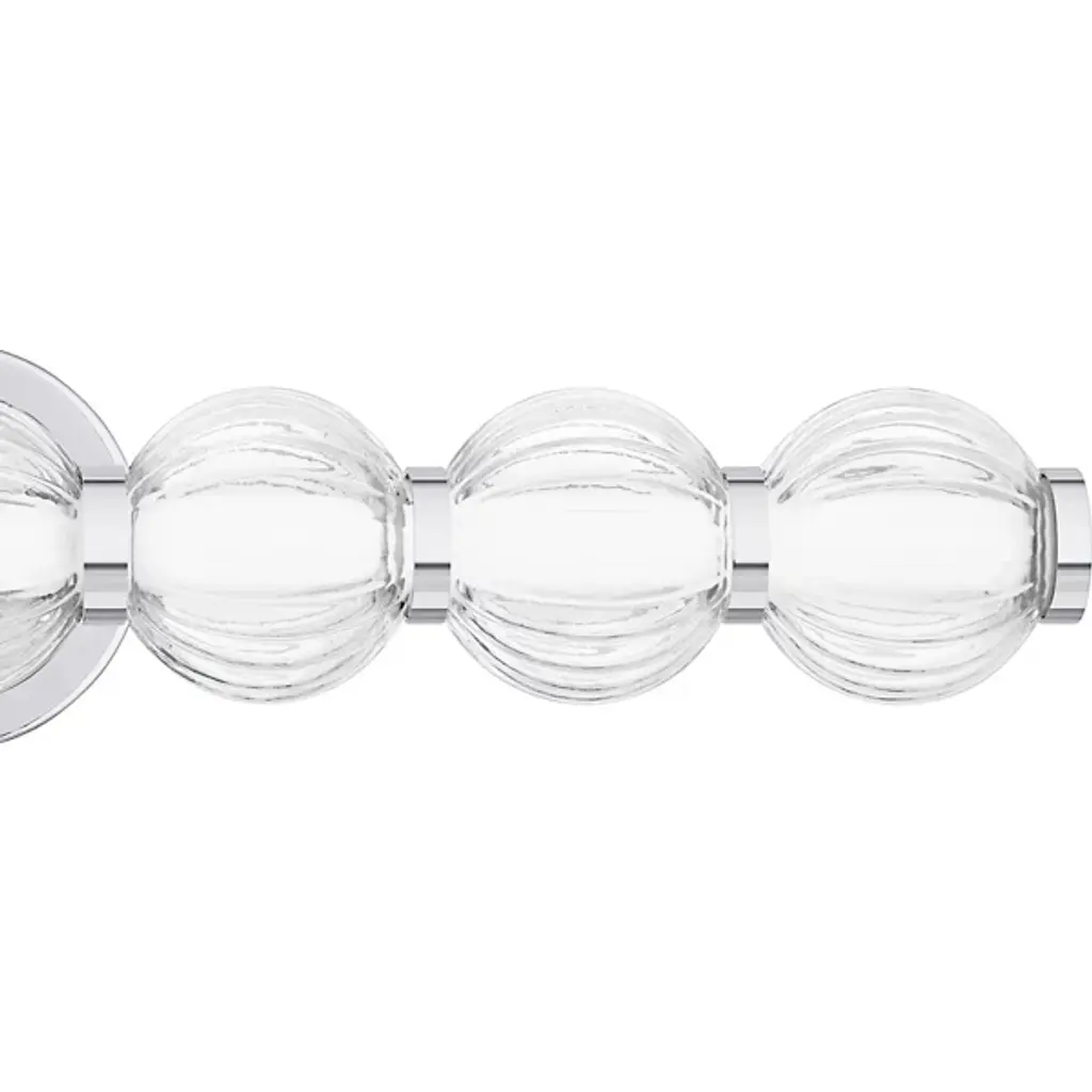 The Elway LED Vanity Light from Quoizel adopts a playful approach to bathroom lighting with its string of ribbed glass spheres that create delightful light patterns. The sturdy steel construction ensures lasting performance while integrating smoothly with diverse décor styles. This versatile fixture can be mounted horizontally or vertically according to preference, making it adaptable to different bathroom layouts. Compatible with dimming systems, it offers adjustable lighting intensity to match different times of day.