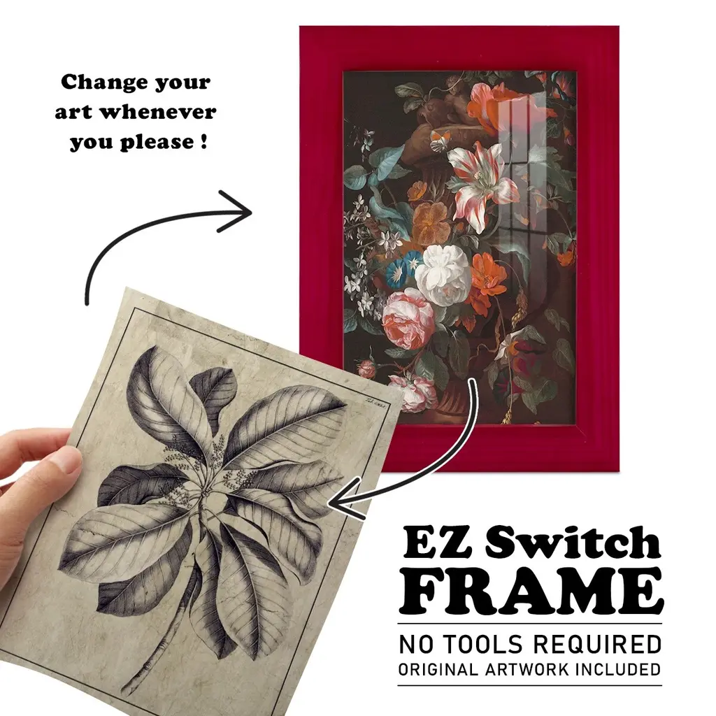 Embellished Antique Foliage II -EZ SWITCH Framed Print w/glass-Cherry Red A delightful, framed print. Featuring a solid wood frame with real wood glass. This premium print is giclee quality. In addition, every frame features a removable back and table top stand. This allows you to change your art in the future or to just stand the art on a table for a new look. We are sure you'll enjoy our new series of EZ SWITCH Framed Art. Solid Wood Frame Real Glass Removable / Replaceable Art Built in Tabletop Stand Sizes range from 4x6 up to 12x15 - buy just one or pair them up as sets as you see fit.
