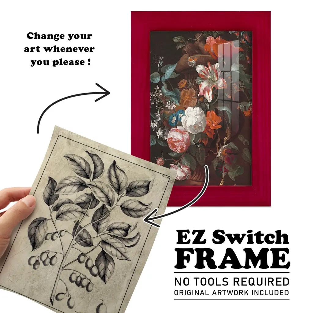 Embellished Antique Foliage V -EZ SWITCH Framed Print w/glass-Cherry Red A delightful, framed print. Featuring a solid wood frame with real wood glass. This premium print is giclee quality. In addition, every frame features a removable back and table top stand. This allows you to change your art in the future or to just stand the art on a table for a new look. We are sure you'll enjoy our new series of EZ SWITCH Framed Art. Solid Wood Frame Real Glass Removable / Replaceable Art Built in Tabletop Stand Sizes range from 4x6 up to 12x15 - buy just one or pair them up as sets as you see fit.