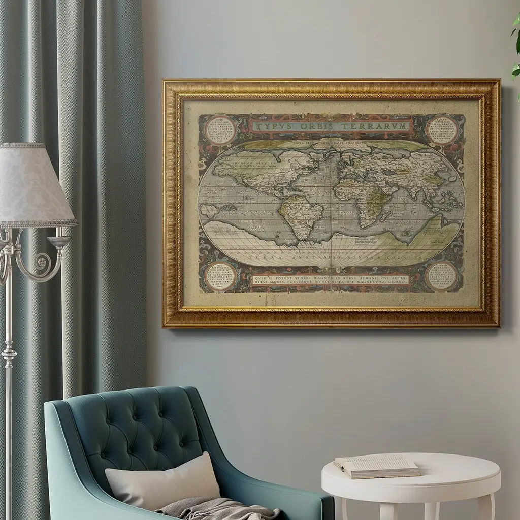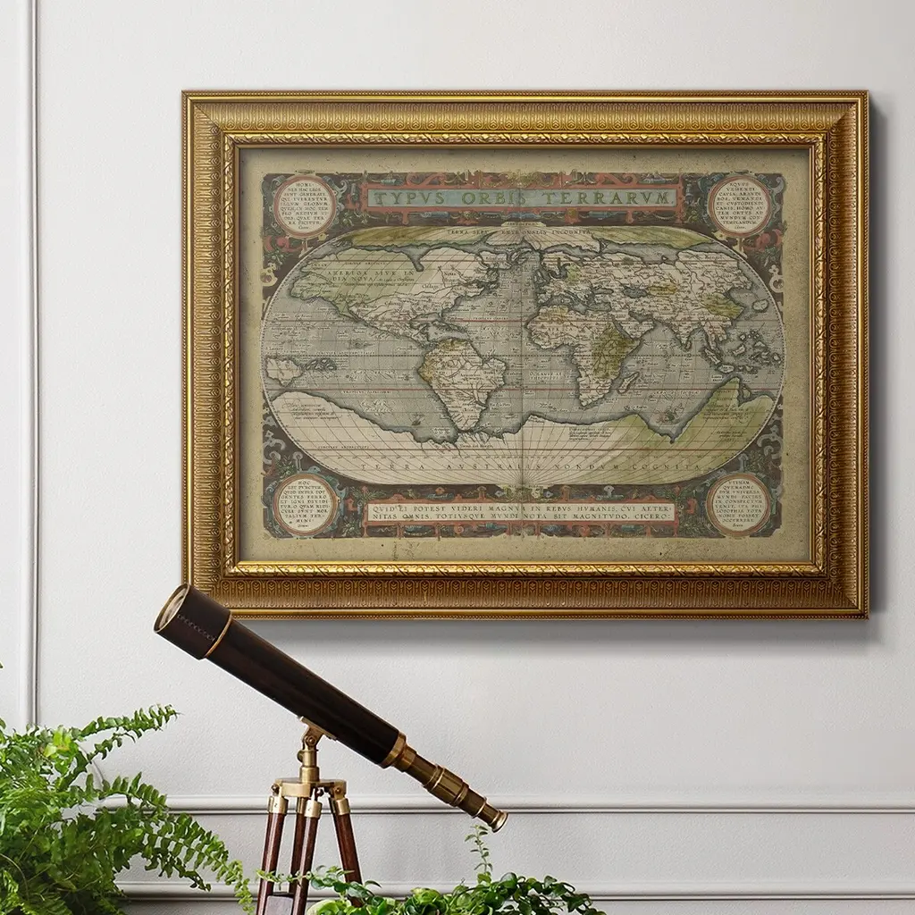 Embellished Antique World Map Premium Framed Canvas- Ready to Hang A Premium Framed Canvas created to last. Framed in distressed wood and available in an array of sizes and colors Featuring a beveled a solid wood stretcher bar, each piece comes ready to hand 3 SIZES AVAILABLE 16''X20'' - Overall Size 18'X27'' - Overall Size 24''x36'' - Overall Size Each piece is made to order. Each piece comes with hanging hardware. Made in the USA Ready to Hang Giclee Paper Print Acrylic Glass Beveled Matt Board