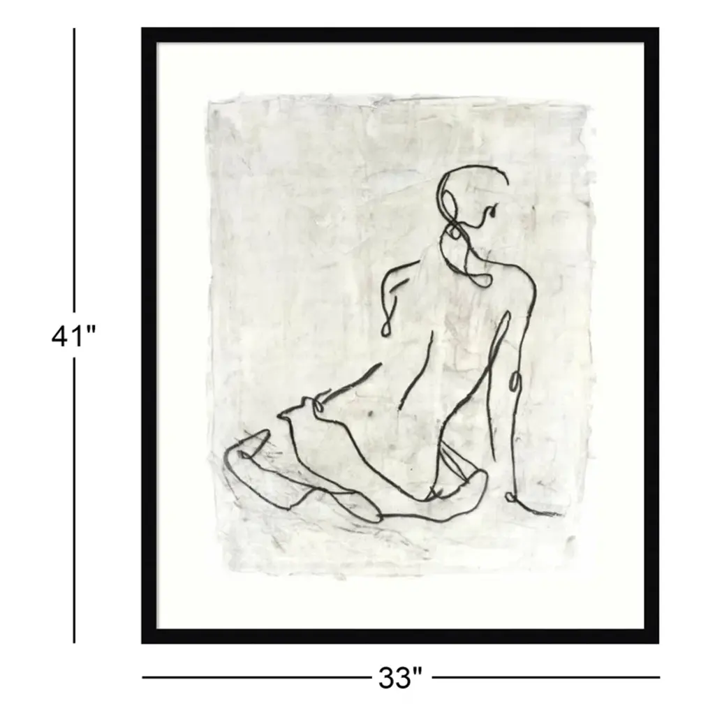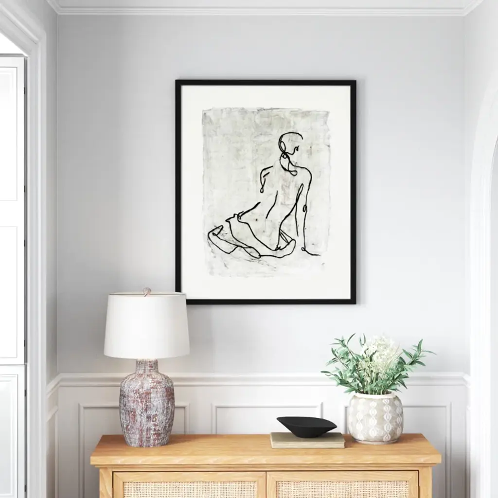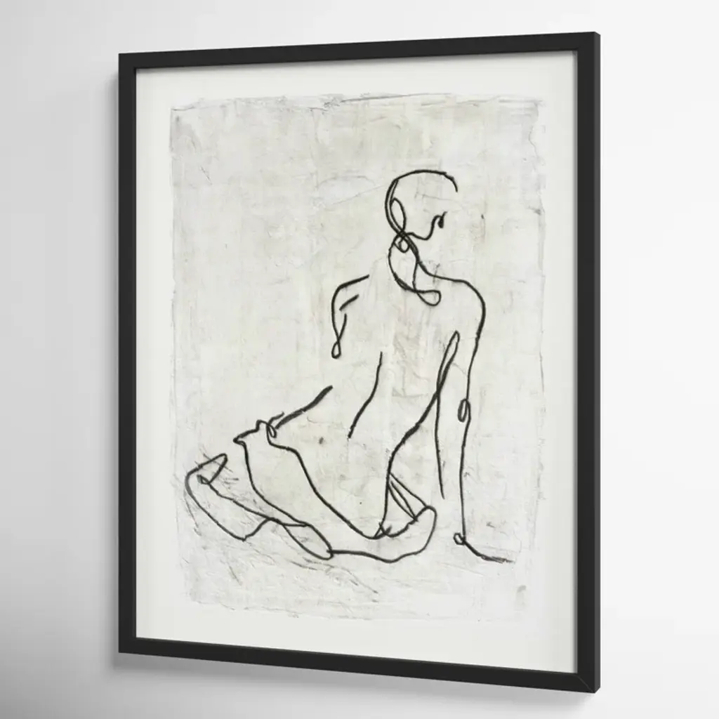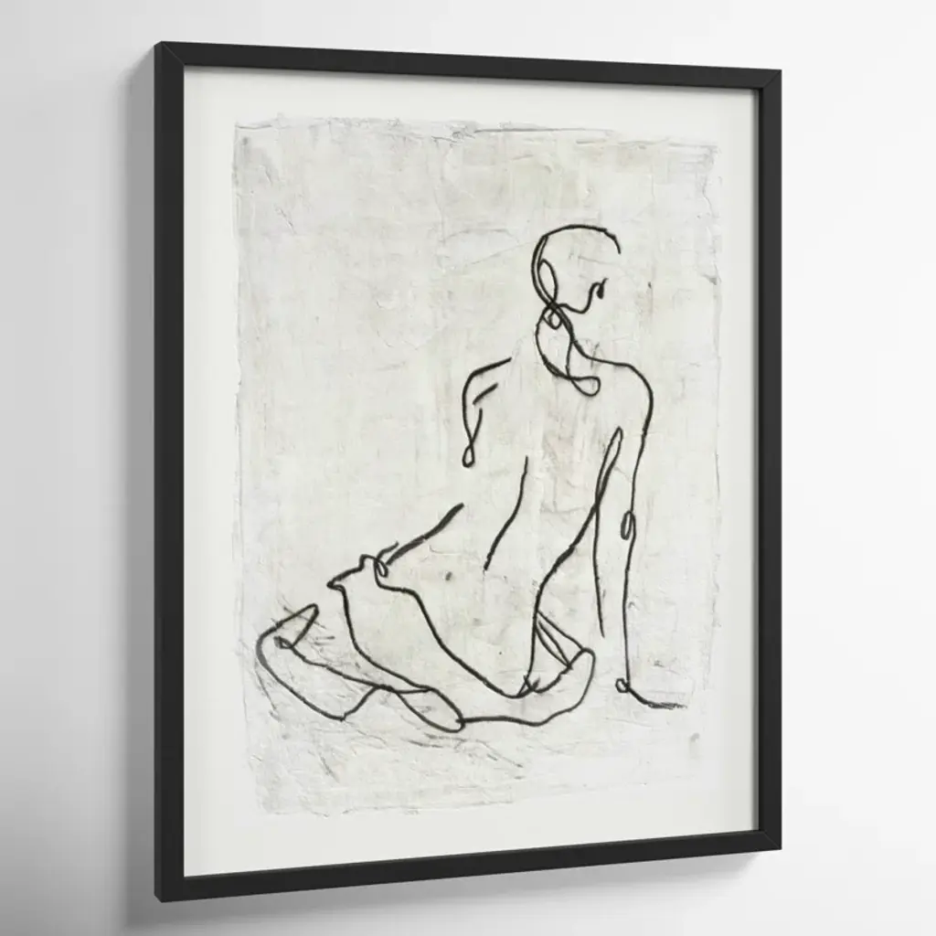 Embrace the human form with this captivating minimalist piece. It features an elegant sketch of a woman, her lines drawn in deep charcoal against a subtly textured grey backdrop. Housed in a crafted open corner frame, this machine-made drawing print is a striking addition to any room. The portrait's subdued elegance lends a serene vibe to your space, whether it's your living area, hall, or bedroom. Plus, its quality is as good as what you'll find in a local frame shop. Enjoy the sophistication it brings!