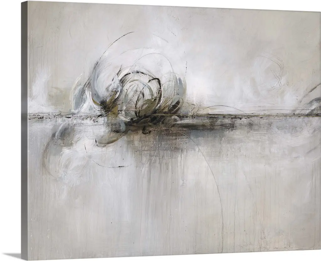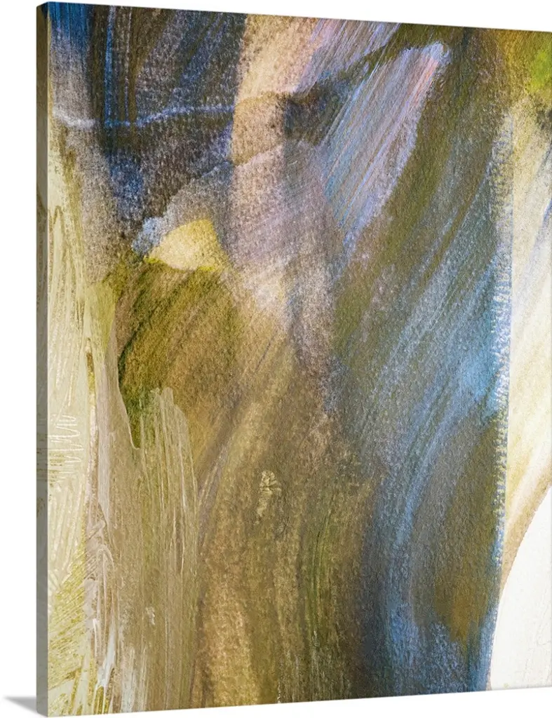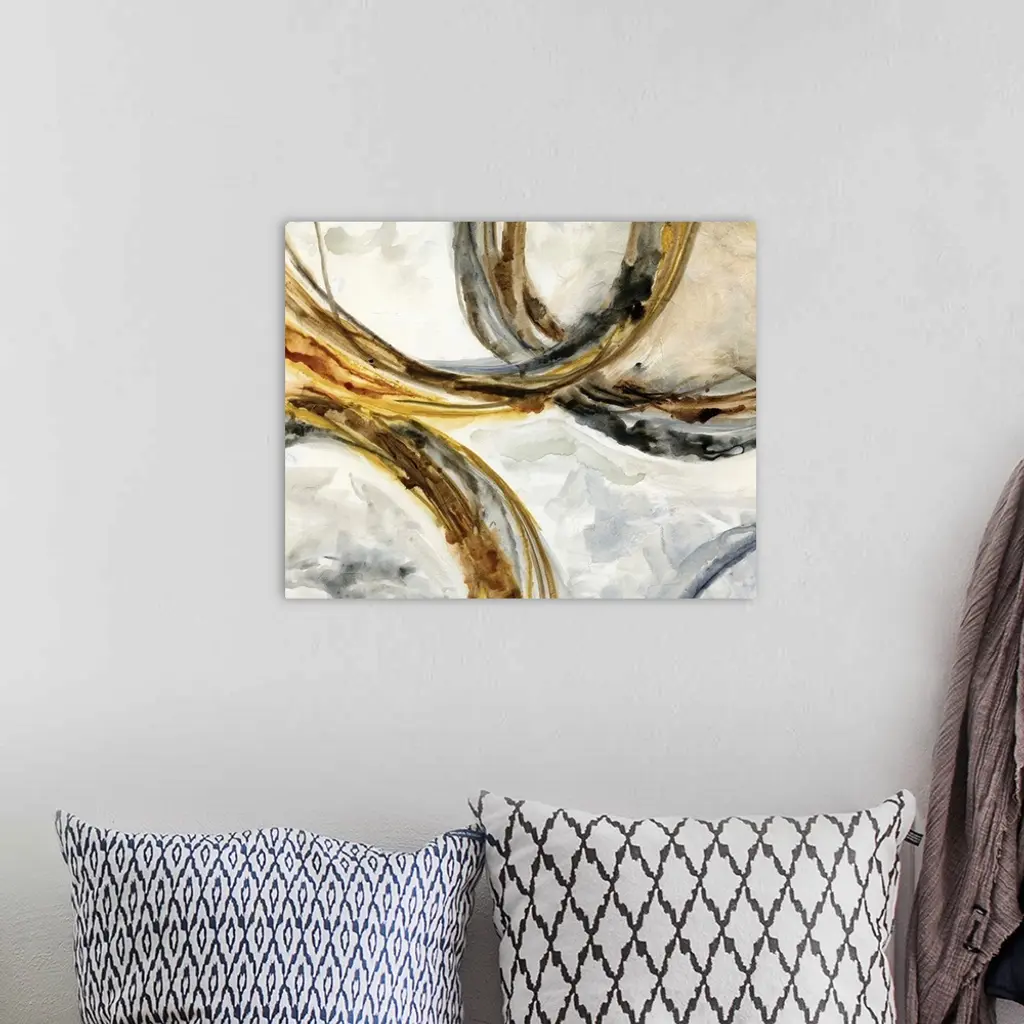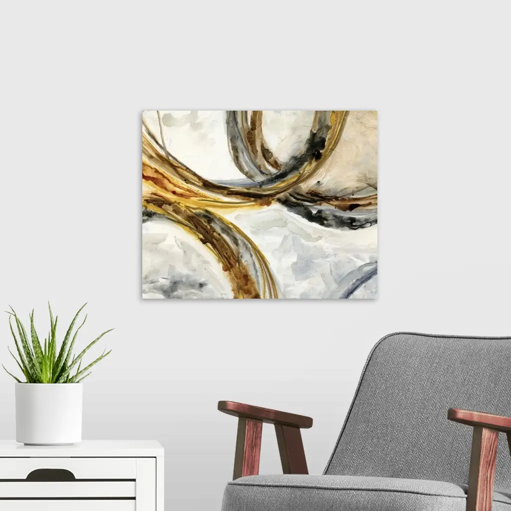 Abstract watercolor painting with gold, black, and brown rings intertwining on a background made with indigo, gray, and brown hues.