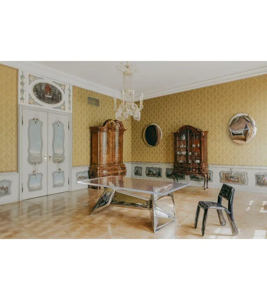 Emerald Oko 150 sculptural wall mirror by ZietaDimensions: diameter 150 x depth 6 cm Material: stainless steel. Finish: Emerald.Available in finishes: stainless steel, deep space blue, emerald, saphire, saphire/emerald, dark matter, and red rubin. Also available in different sizes: ø 36, ø 62, ø 75, ø95 and, ø 120cm.Round-shaped mirrors are classic elements of elegant interior design. The OKO mirror by Zieta Studio is a mysterious steel object with a reflective surface. It is available in numerous versions: diverse sizes and lacquered finishes. The OKO Ruby Red & OKO Dark Matter mirrors from the Transitions Collection resemble noble gemstones – the mixture of red and black colors gives it an intriguing character.The colors of the superb Transitions Collection, black and red that fade and intensify depending on the point of view, infiltrate each other and generate fantastical reflections of the surroundings. Thanks to its finish, the OKO mirror’s minimalist form gains an opulent aspect. It will fit interiors arranged in a generously classical style.The distorted edges of the mirror are the effect of the manufacturing method Zieta Studio applies in their collection of wall decor. Called FiDU technology, it is based on joining two pieces of steel, which then gain a third dimension in the process of inflating into tridimensional objects with compressed air.About Zieta: Zietas main goal is to deliver uniqueness and customization in design and construction while keeping the production, transport, and warehousing innovatively efficient.This is how they imagine the future world: Light, durable structures of customized applications produced on demand out of one-of-a-kind parts, yet efficiently.They use a computer-controlled production process. Customized pattern, customized form, customized function, one-of-a-kind product, and outstanding precision are what they deliver.You will find all of this philosophy reflected in the products. The research, they discover new possibilities, they play with forms and they deliver a beautiful, innovative, surprising outcome to people who love the design and who care about design development.They believe their work is a valuable contribution to the world of design not only by the unique beauty of the forms but most of all by opening ultra-innovative opportunities of forming and new paths for the world of the future. __.