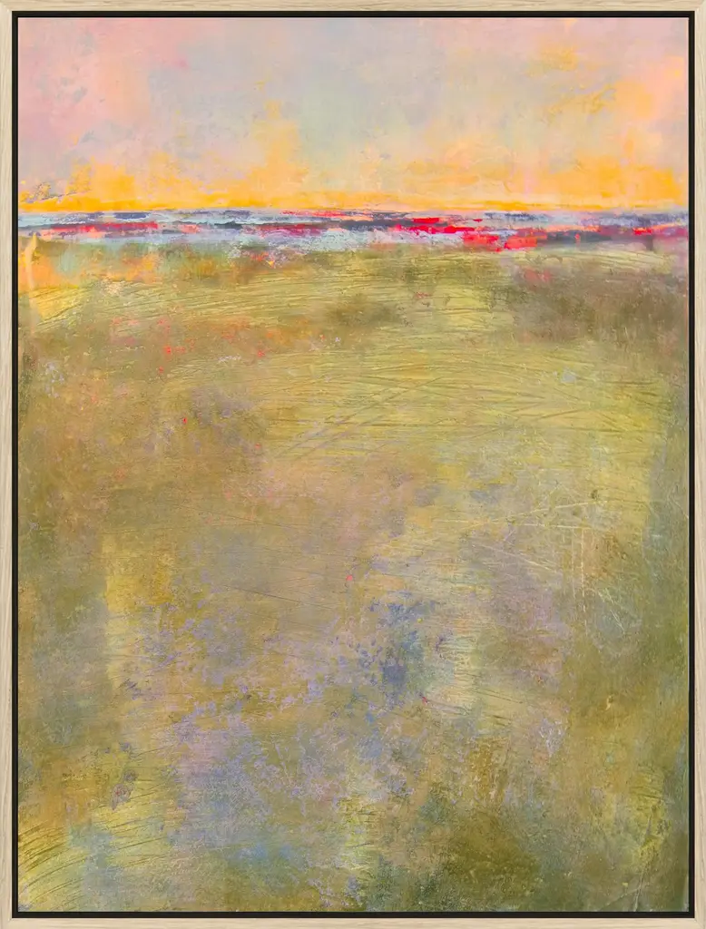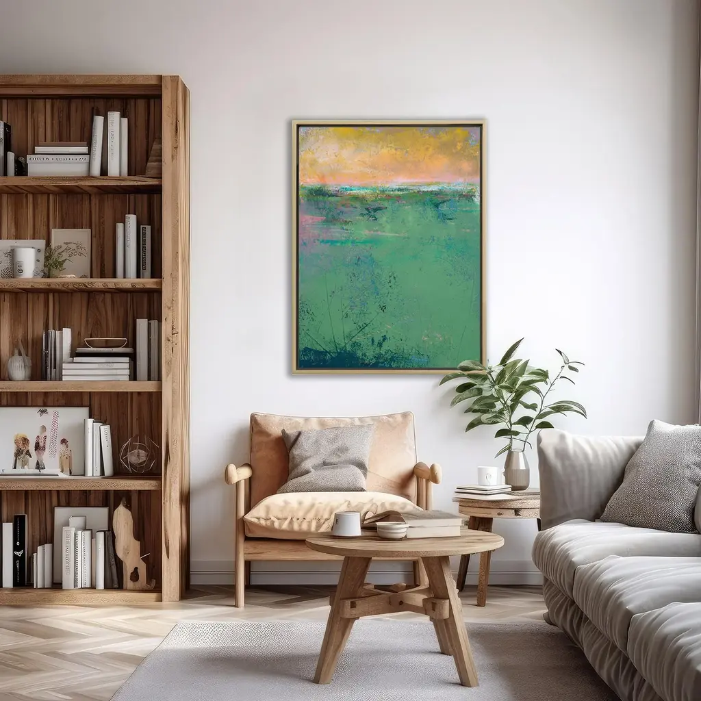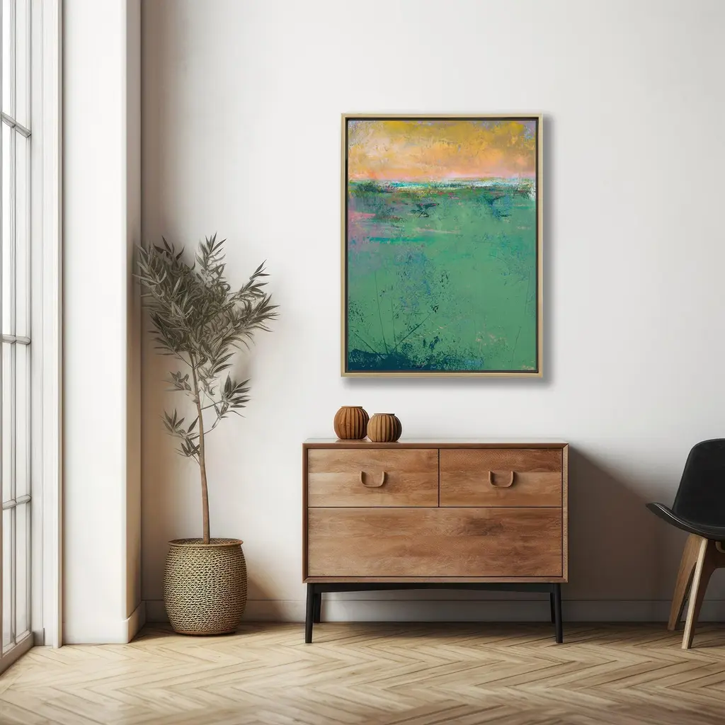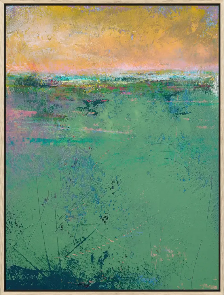 "Emerald Reverie" offers an abstract retreat. A luminous yellow sky sits above a green backdrop, accented by vibrant splashes of blue and purple. This captivating piece transforms any space into a serene haven, radiating calming energy while revealing new layers of beauty with every gaze. ● Archival giclée print on stretched canvas showcases a seamless image wrap around the sides for a polished look ● Slim, simple natural wood frame adds subtle warmth without distracting from the artwork ● Ships free and arrives wired, ready to elevate your space with style