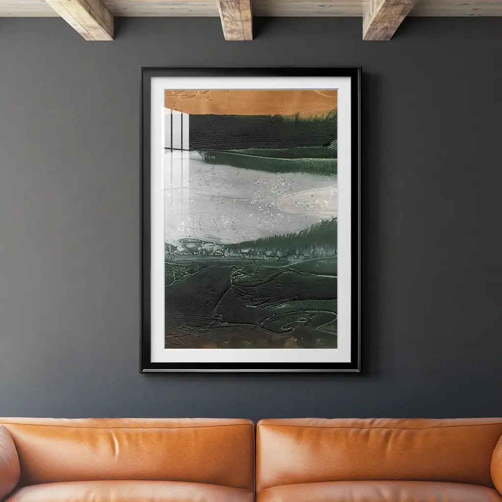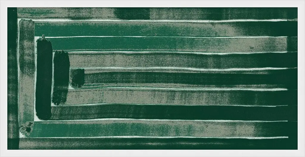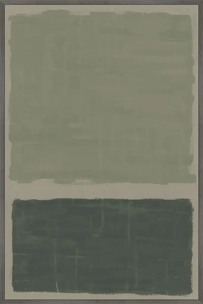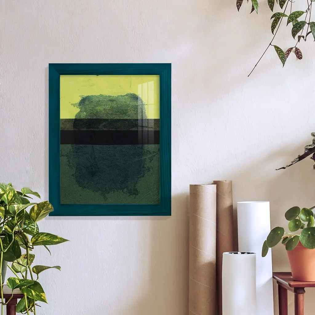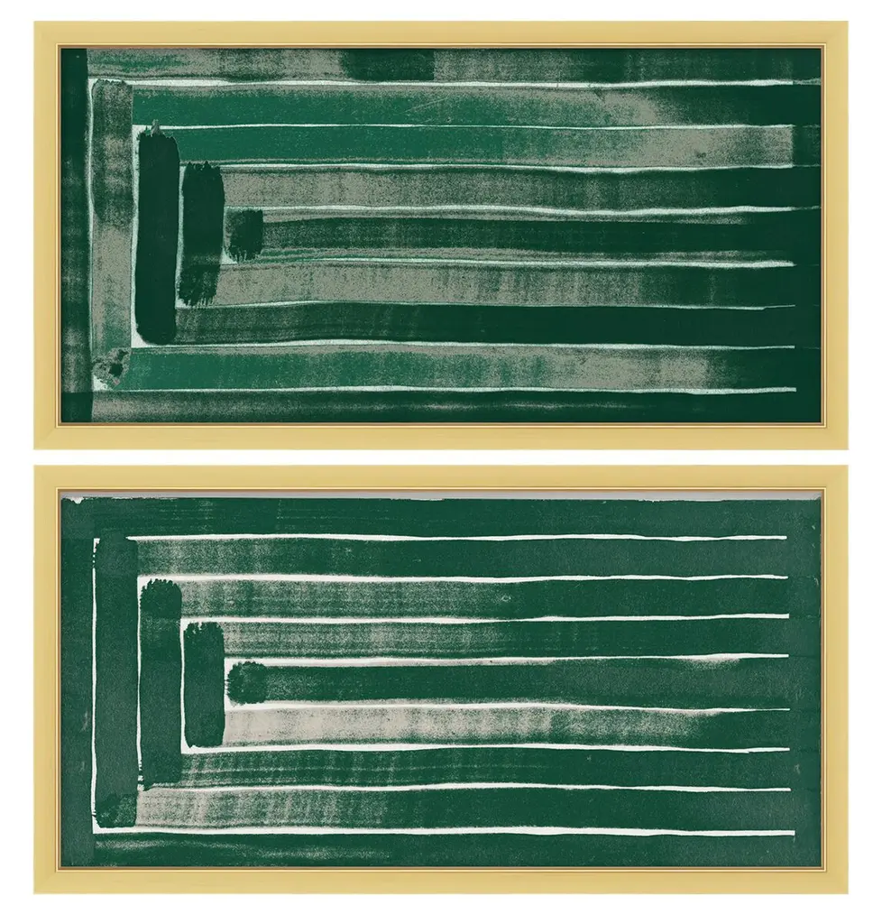 Designed by us and available only at One Kings Lane: A reproduction of an original work, this minimalist abstraction in emerald green is printed on matte paper and displayed under glass in a simple frame. Arrives ready to hang.